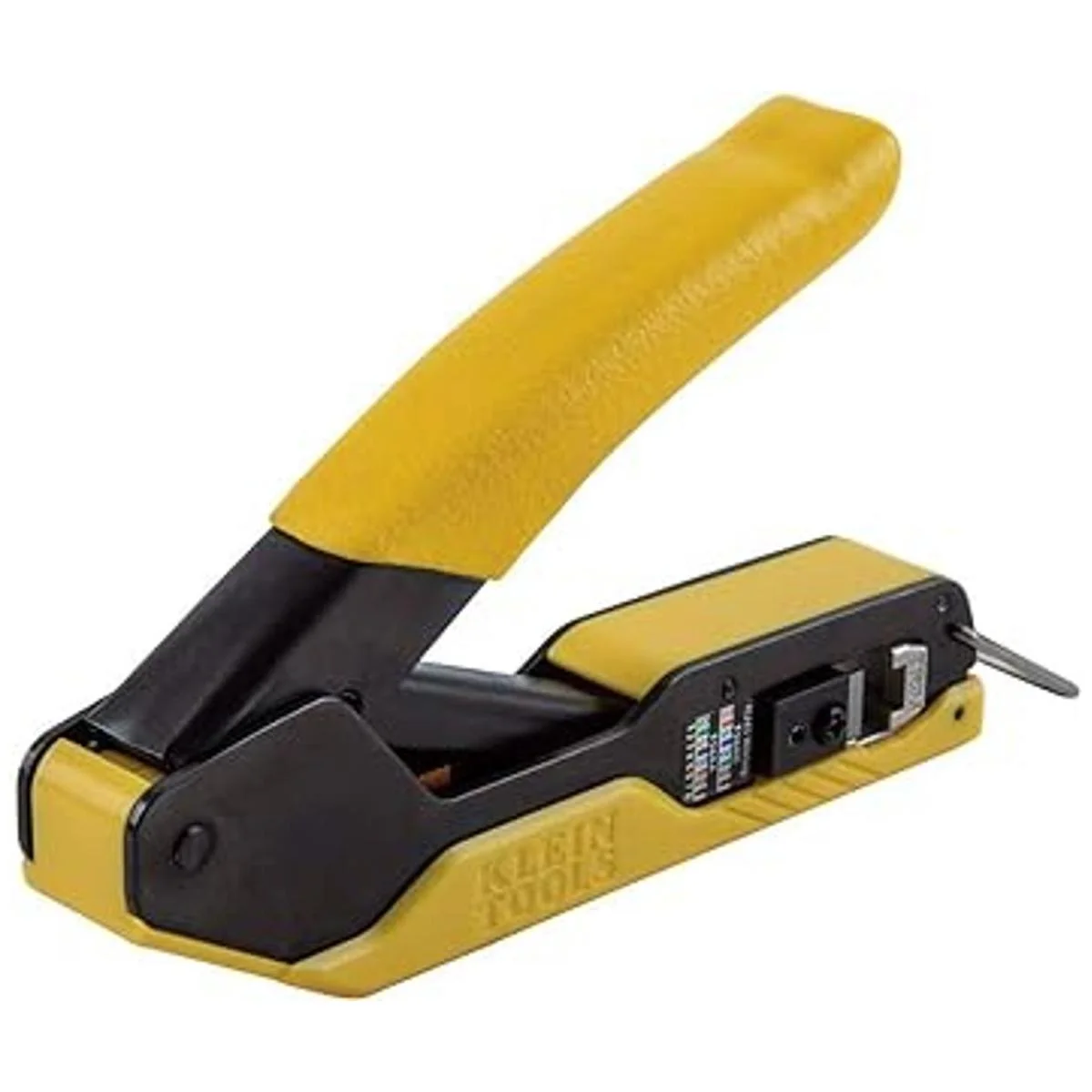 La crimpadora compacta engarza y recorta los conectores RJ45 de Klein Tools en cables conductores emparejados cables STP/UTP