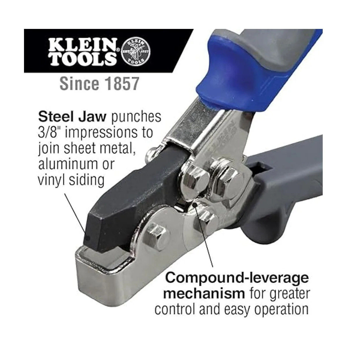 La mandíbula de acero forjado perfora fácilmente impresiones de 0.4 in de ancho en bordes de metal para unir fácilmente piezas de chapa, conducto o tubo