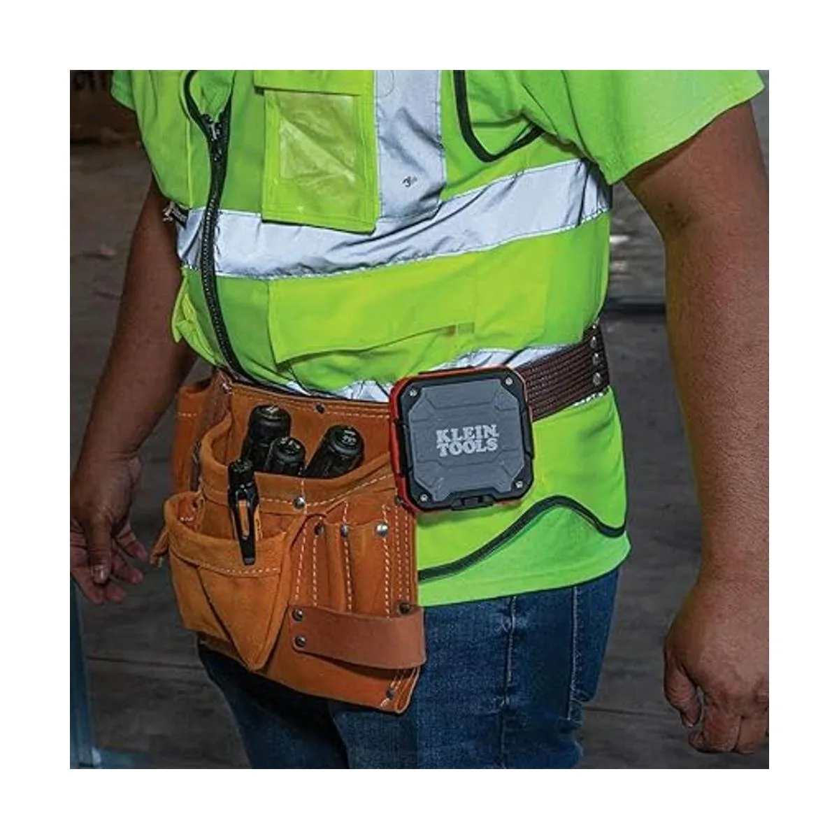 Klein Tools AEPJS2 Altavoz Bluetooth, altavoz portátil inalámbrico para lugar de trabajo reproduce audio y responde llamadas manos libres, con correa magnética