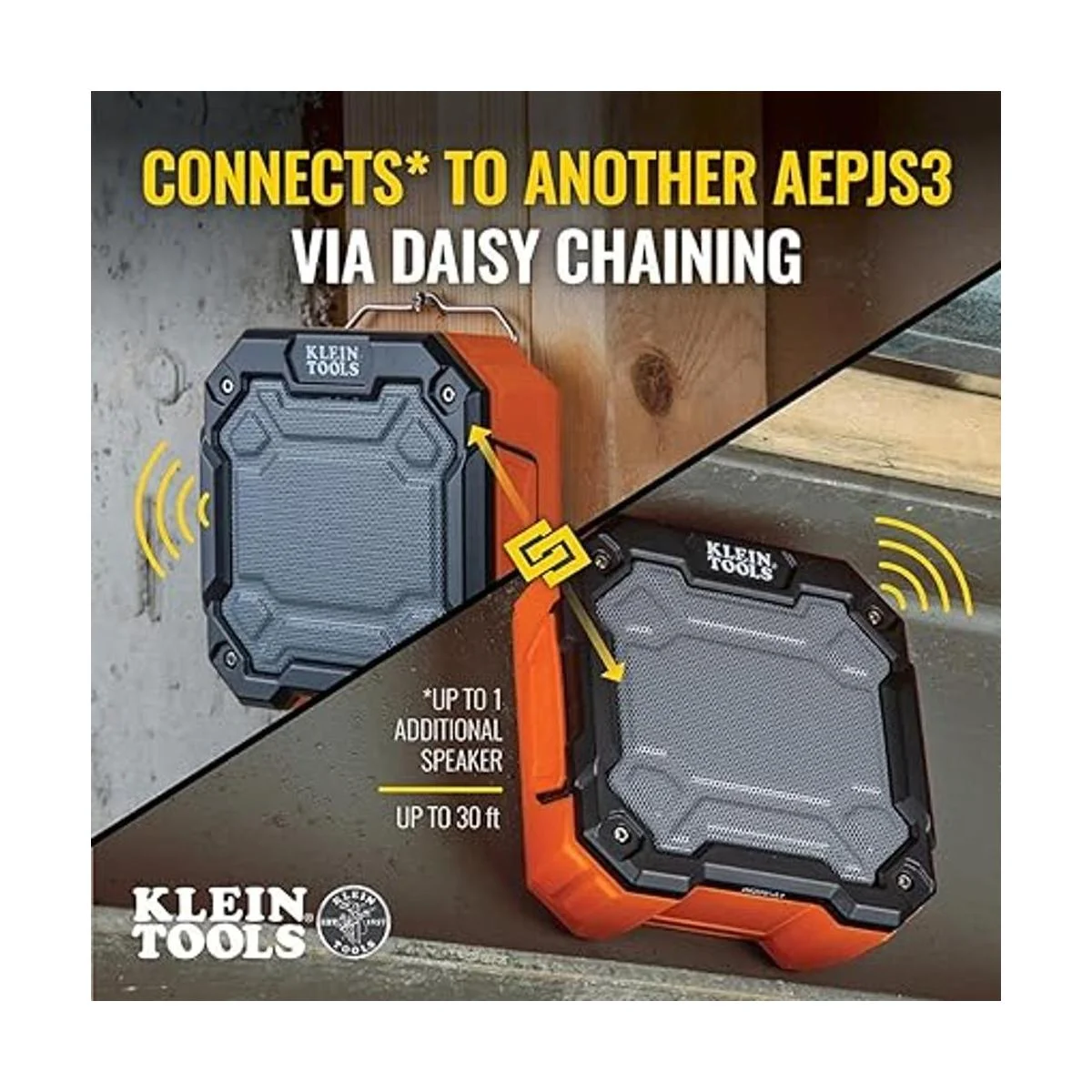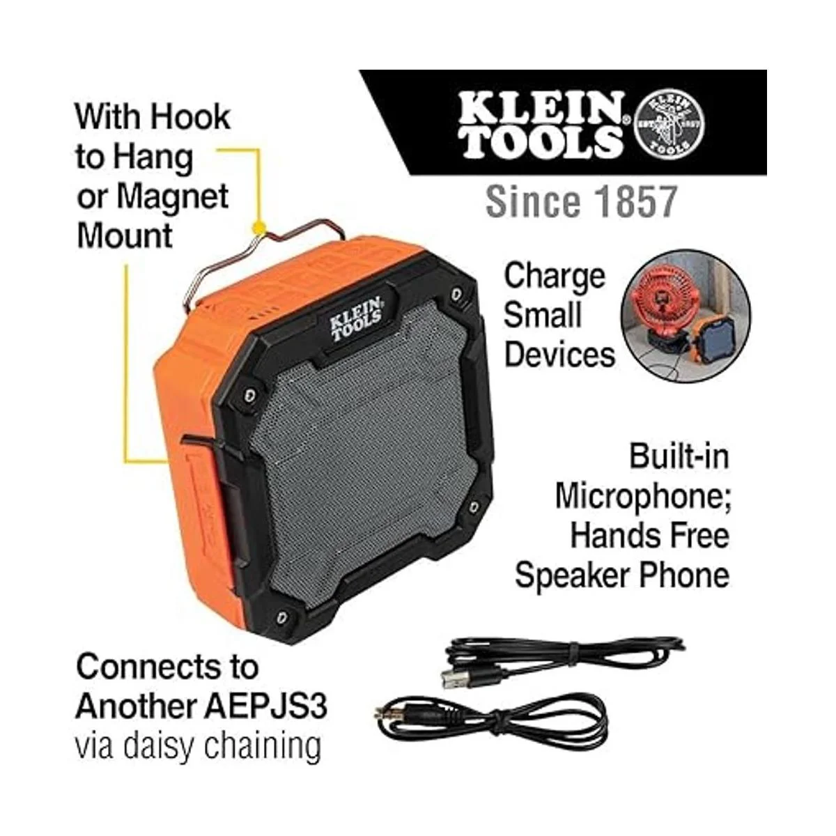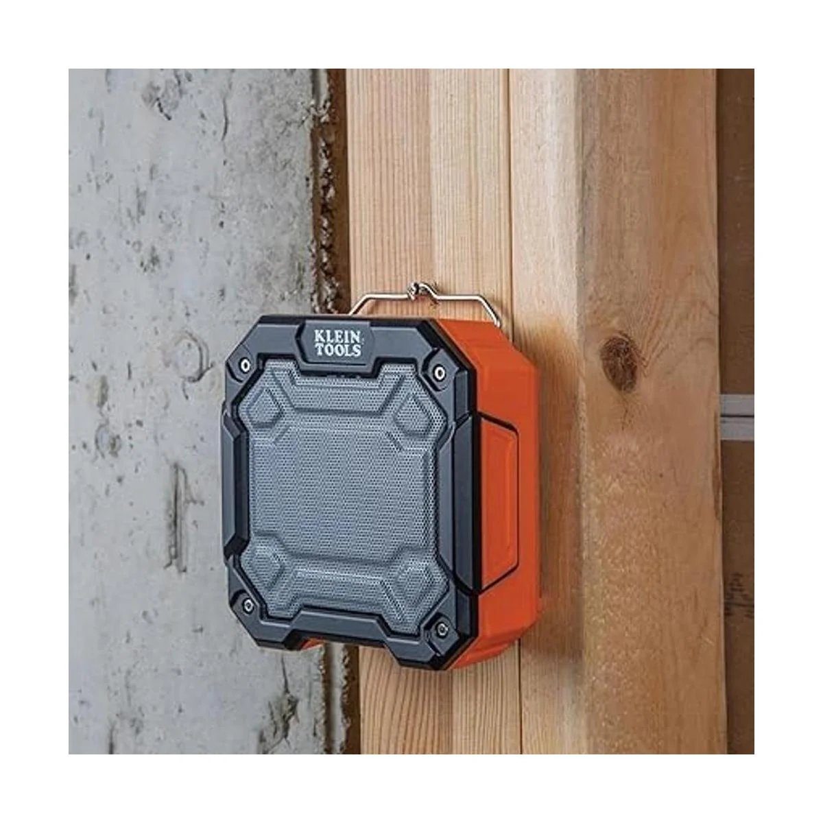 Klein Tools AEPJS3 Altavoz Bluetooth 4.2, altavoz inalámbrico portátil para lugar de trabajo, reproduce audio y carga teléfonos inteligentes, con imán y gancho
