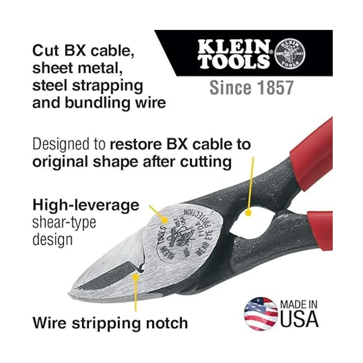 Klein Tools Cortador de cables BX 1104 y tijeras multiusos para cable BX, chapa, flejes de acero, alambre de agrupación, con muesca de pelado