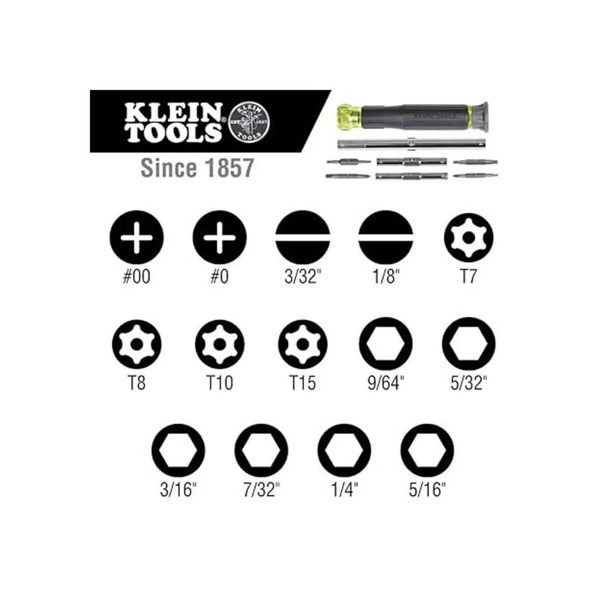 Incluye tamaños: Phillips 00, 0; ranurado 3/32 pulgadas, 1/8 pulgadas; Torx T7, T8, T10, T15; Hex 9/64 pulgadas, 5/32 pulgadas, 3/16 pulgadas, 7/32 pulgadas, 1/4 pulgadas, 5/16 pulgadas.