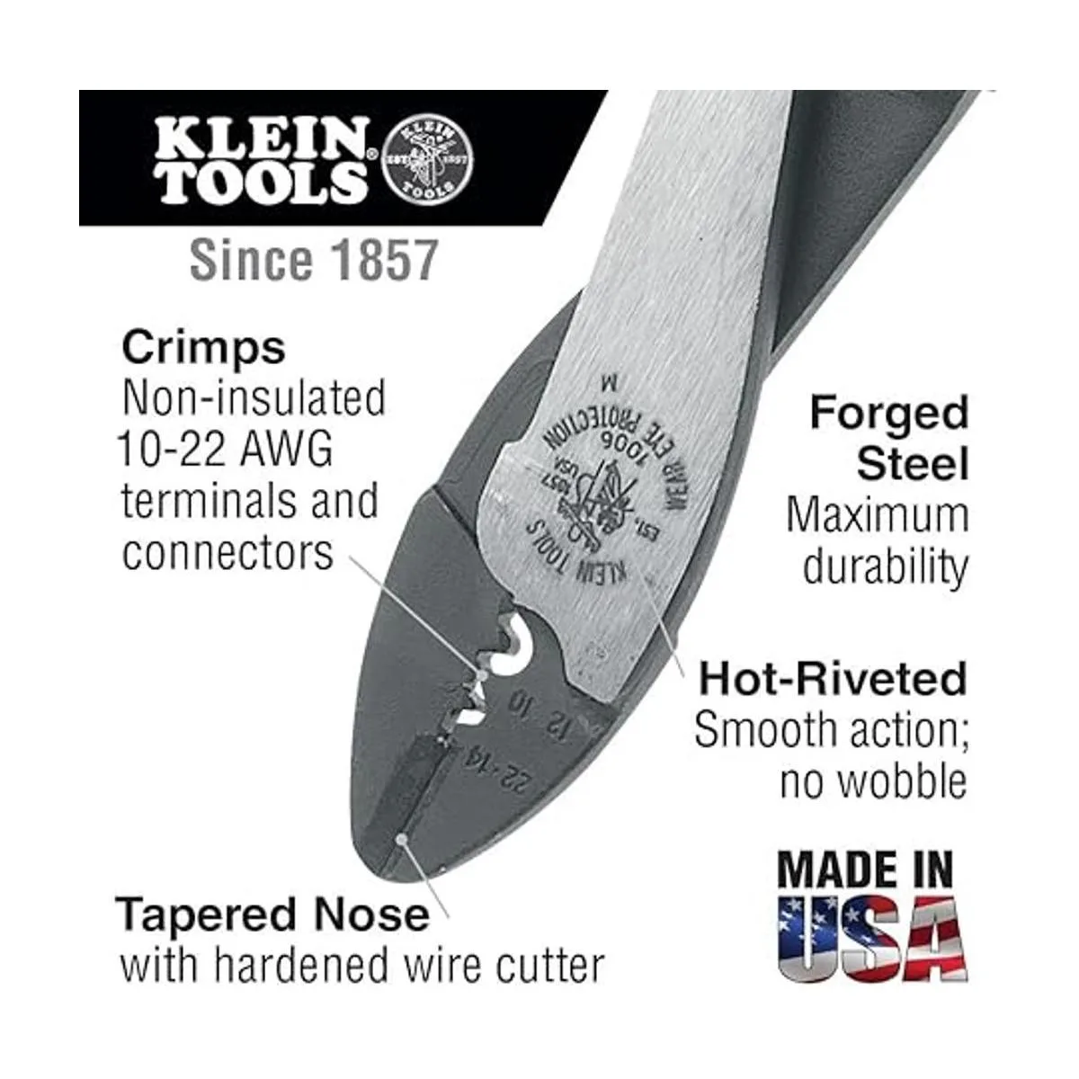Klein Tools Herramienta de corteengarzado 1006, engarza terminales y conectores sin soldadura de 10 a 22 AWG, con cortador de alambre en nariz cónica