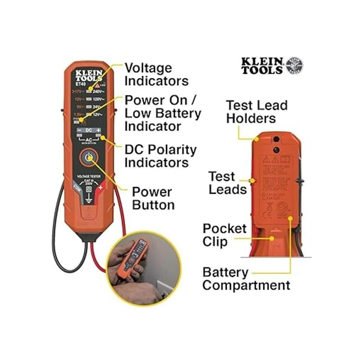 Klein Tools Probador de voltaje ET40, voltaje de CA, voltaje de CC y polaridad de CC, probador de bajo voltaje incluye baterías