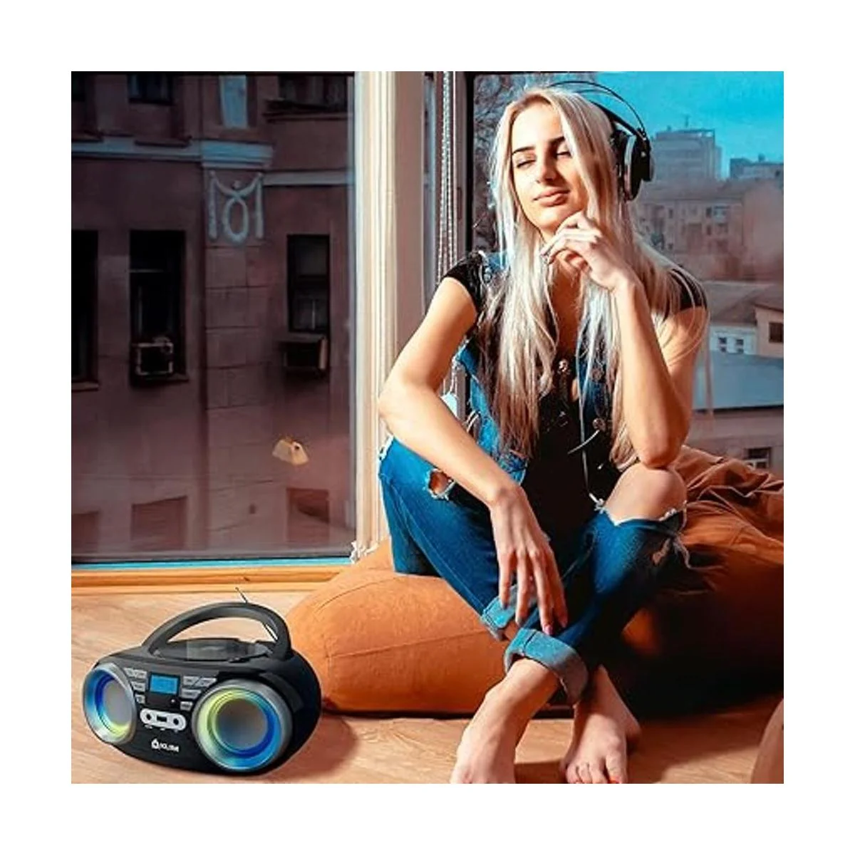 Diseño compacto y cómodo combinado. El sistema KLIM Boombox es muy ligero y compacto para que puedas llevarlo a cualquier lugar contigo. Está equipado con Bluetooth y un puerto auxiliar AUX que te permite conectarlo a tu teléfono u otros altavoces. Incluso puedes conectar una memoria USB y escuchar miles de canciones en formato MP3. Importante: retira el cartón protector de la lente antes de insertar un CD.