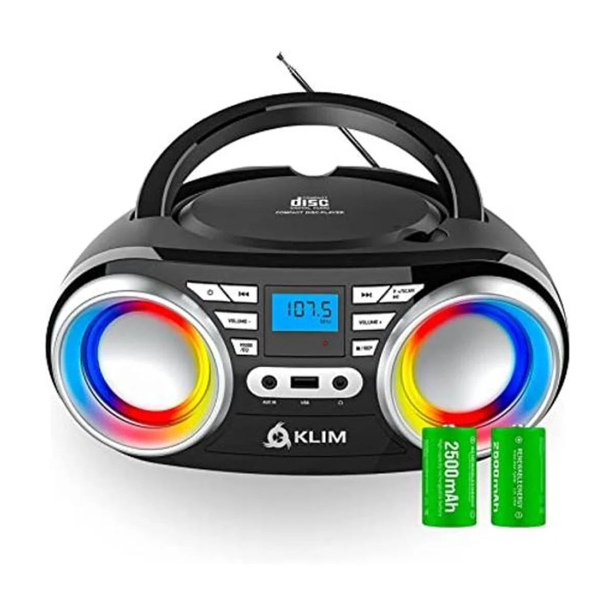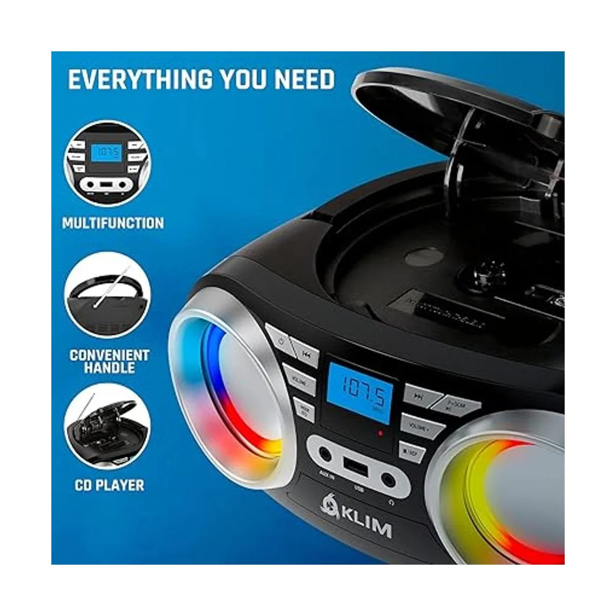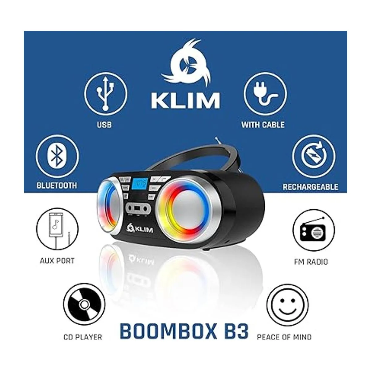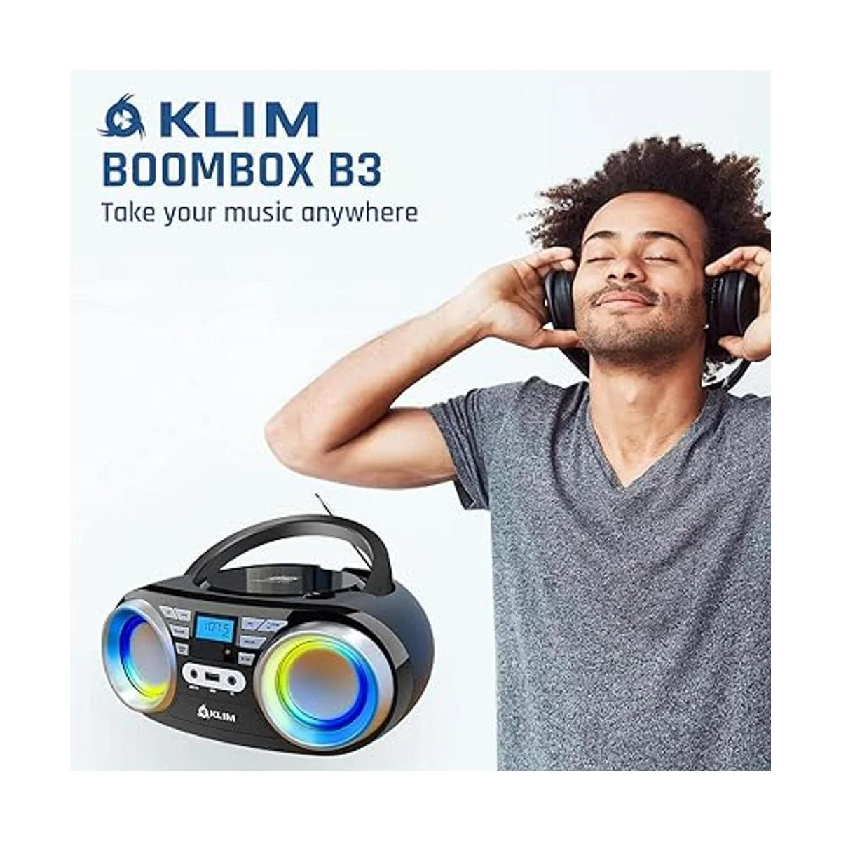 KLIM B3 CD Boombox Reproductor de CD de audio portátil, radio FM, batería recargable, Bluetooth, MP3 y AUX, nueva versión 2022, equipado con altavoces de neodimio súper graves, lente láser CD mejorada, color negro