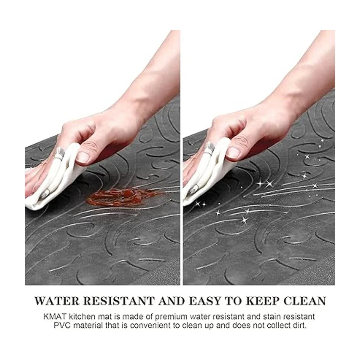 Antideslizante: la alfombrilla acolchada antifatiga KMAT está diseñada con un borde biselado único. La zona superior resistente al agua tiene una textura atractiva y la parte inferior es súper antideslizante, útil para evitar tropiezos y deslizamientos. Nota Abra la alfombra totalmente en un suelo plano, seco. El agua debajo del tapete puede ocasionar deslizamiento. La alfombra debe colocarse en una superficie seca durante el uso.