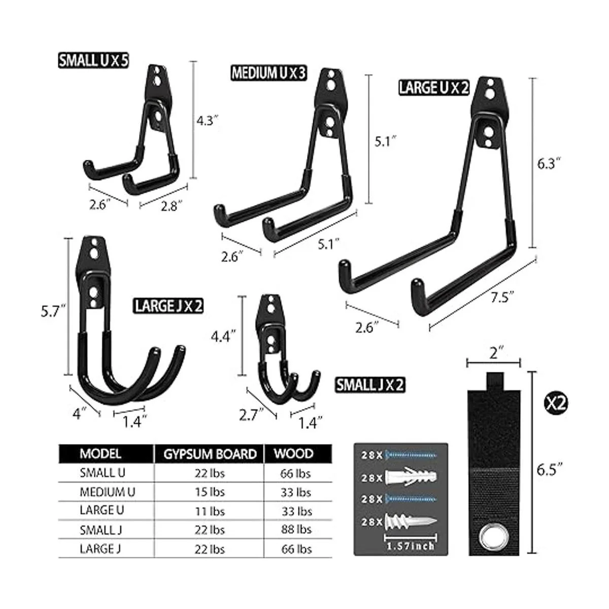 Varios tamaños: hay 14 ganchos de garaje resistentes con 5 tamaños: 5 ganchos pequeños en U, 3 ganchos medianos en U, 2 ganchos grandes en U, 2 ganchos grandes en J y 2 ganchos pequeños en J. También proporcionamos 2 correas organizadoras de cables de extensión para colgar herramientas de diferentes tamaños y peso.
