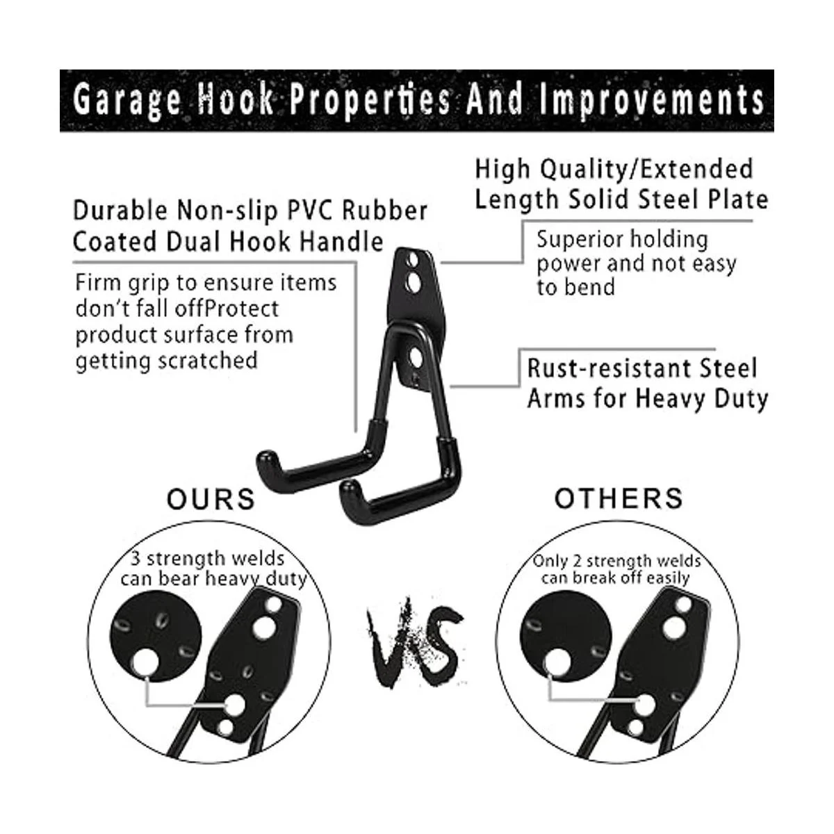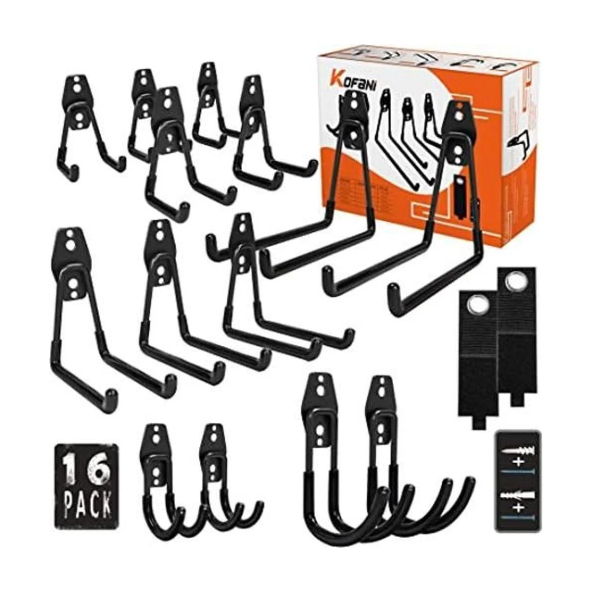 KOFANI Ganchos de garaje, paquete de 16 ganchos de acero resistentes para almacenamiento de garaje con revestimiento antideslizante, ganchos de montaje en pared para colgar bicicleta, escalera y herramientas de jardín