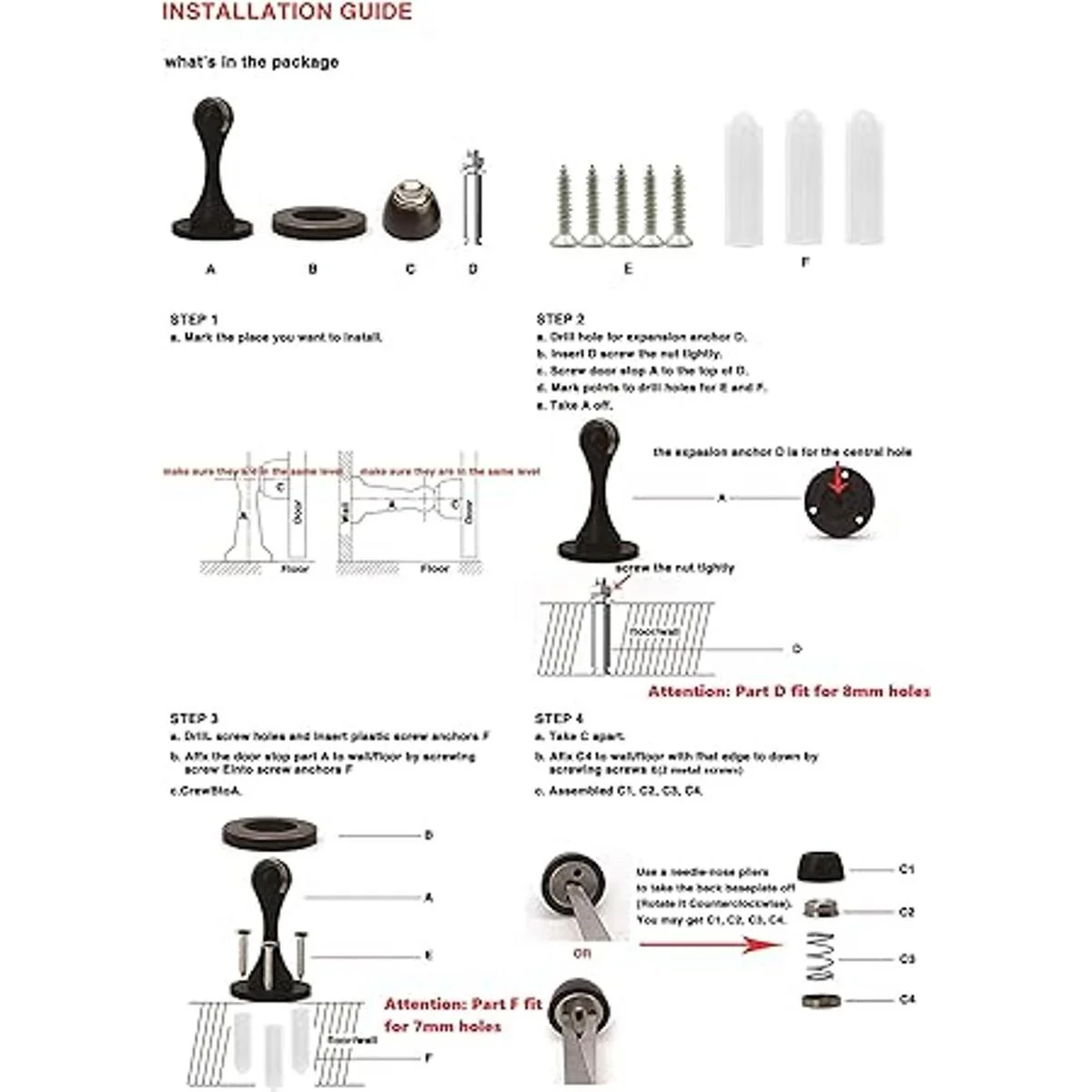 Instalación con tornillos: en comparación con los topes magnéticos adhesivos 3M, nuestro tope magnético de puerta es excelente en una aplicación más amplia, adecuado para paredes de yeso/cemento/pintura de látex; los topes de puerta de doble cara se pueden caer fácilmente, no es resistente; nuestro tope de puerta negro montado en la pared instalado con tornillos, tiene un tiempo de servicio más largo, estable y especialmente práctico en entornos húmedos/húmedos como baño/cocina/inodoro. Viene con manual de usuario y todos los accesorios para una fácil instalación.