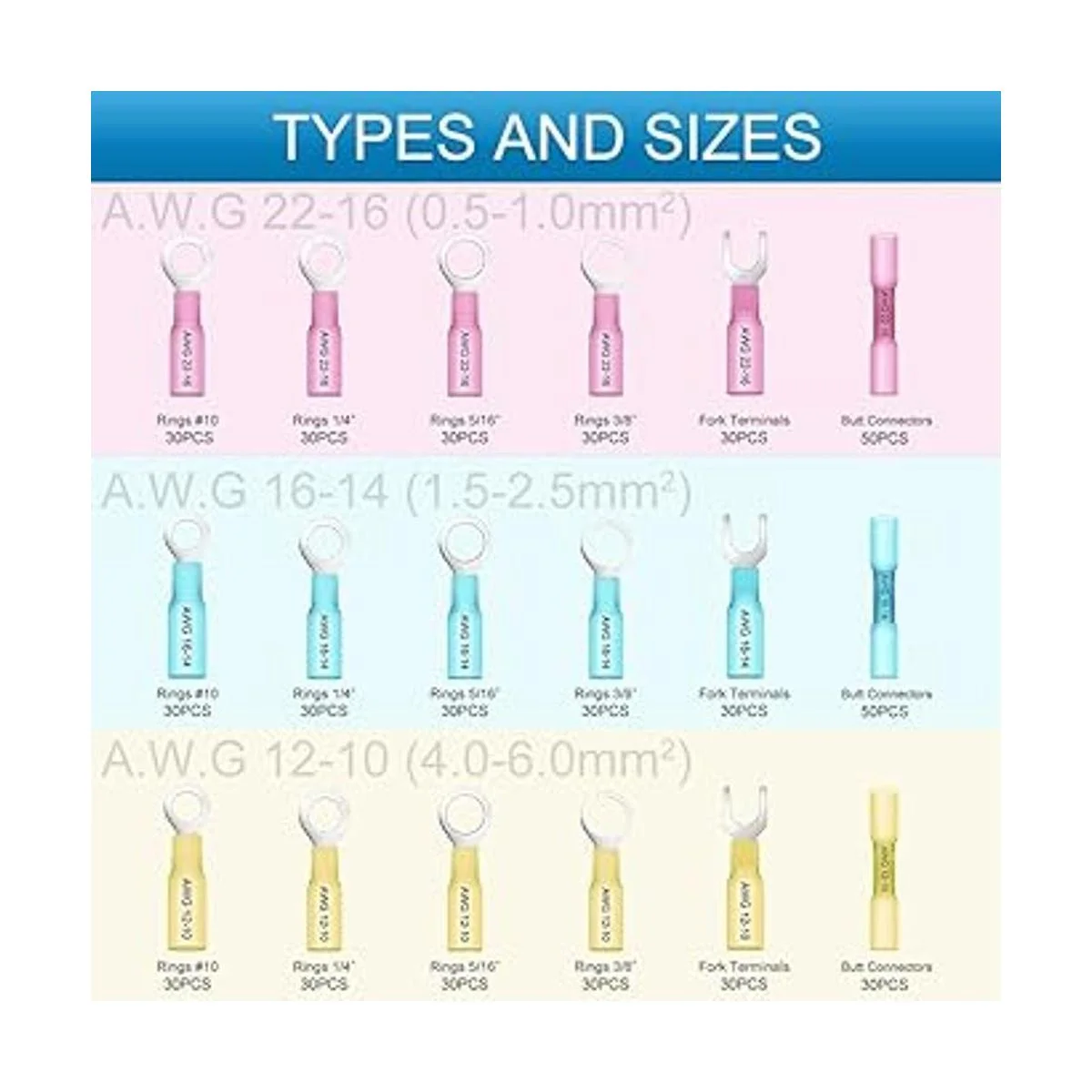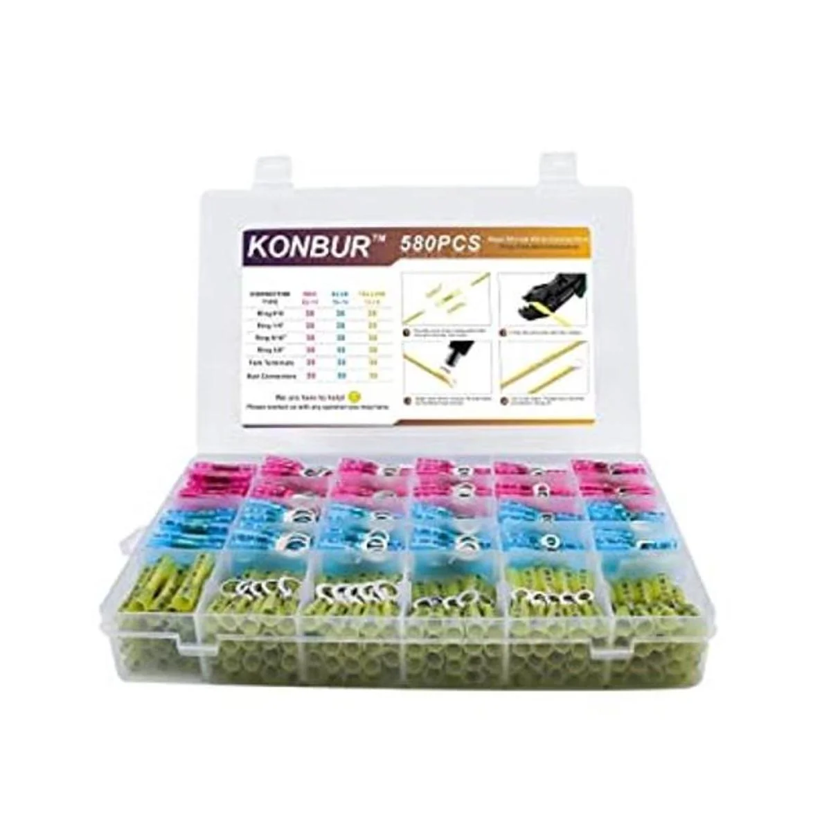 KONBUR 580 conectores de alambre termorretráctiles Kit de terminales eléctricos aislados Surtido de conectores de crimpado para automóviles marinos impermeables Horquilla de anillo de conector a tope