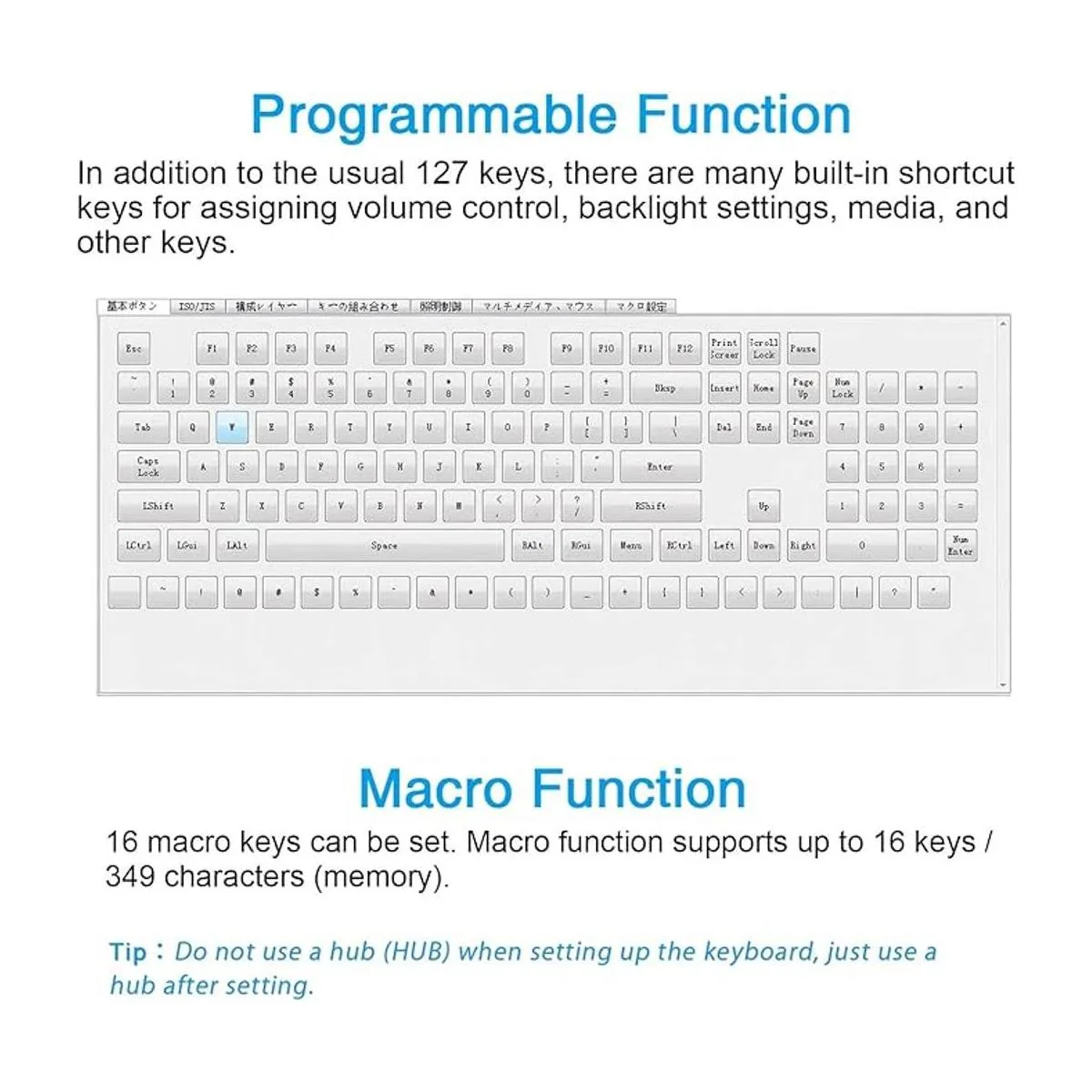 Todas las 45 teclas programables Exclusivo suave y te permite programar todas las teclas. Personaliza para adaptarse a tu entorno. Además de las 127 teclas normales, puedes configurar botones de navegación web, 19 atajos multimedia, cerraduras de teclado, bloqueo de ventanas, etc