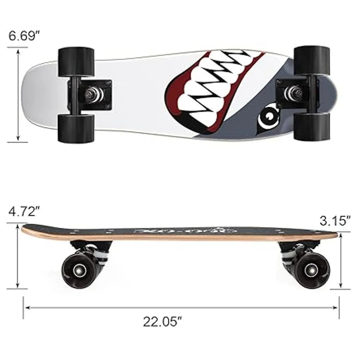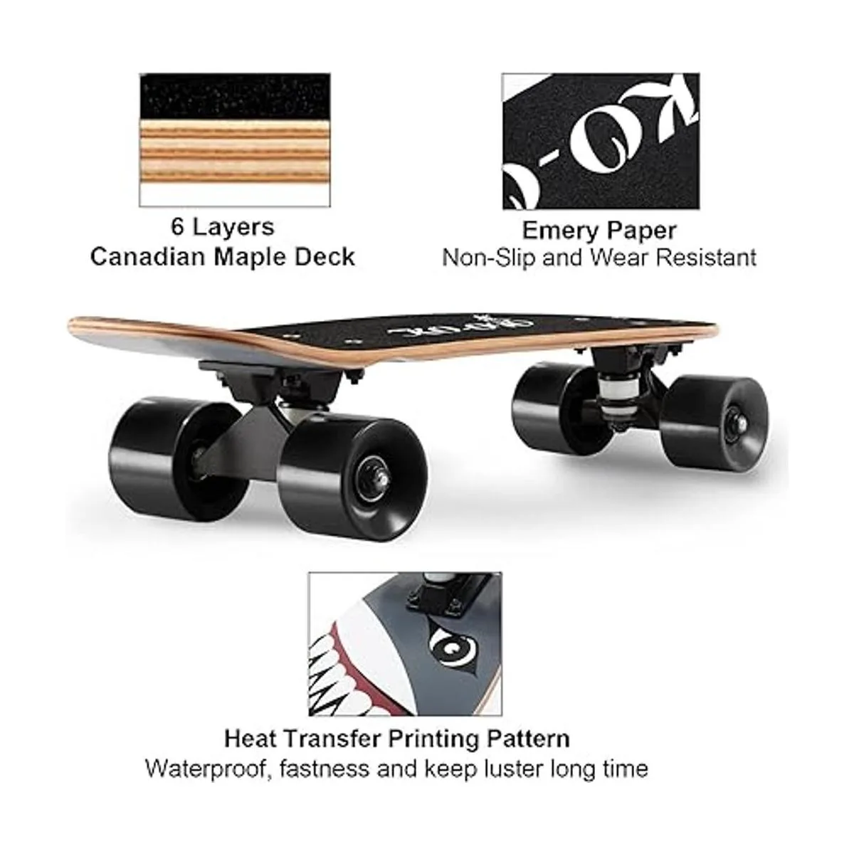 Duradero y resistente: diseño de tamaño completo de 22.05 x 6 pulgadas con cubierta de arce canadiense de 6 capas, soporta patinadores de hasta 275 libras. Nuestra cubierta utiliza papel de esmeril antideslizante y se basa en el diseño de tecnología de impresión de transferencia de calor impermeable y resistente. No solo puede proporcionar más estabilidad y seguridad para los patinadores sino que también mantiene ambos pies en él.