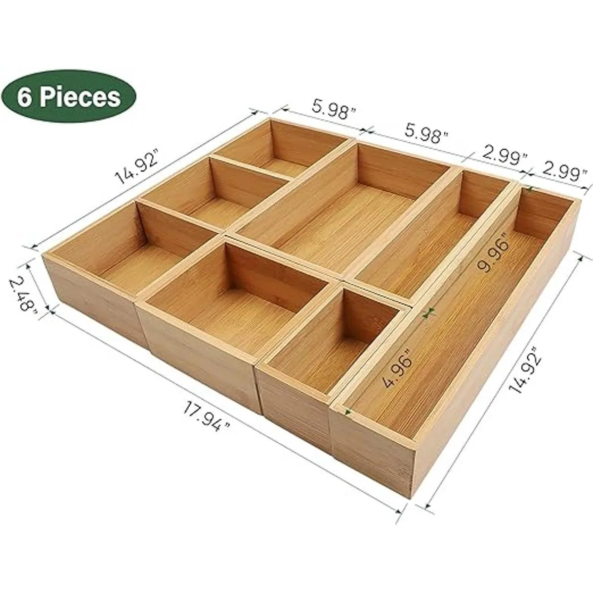 Organizador de cajones versátil: caja de almacenamiento de bambú de 6 piezas con diferentes tamaños que proporciona hasta 8 compartimentos, lo que te permite personalizar el diseño para adaptarse a cajones de diferentes tamaños, se puede utilizar en cajones de cocina/baño/dormitorio/tocador. Perfecto para organizar cubiertos de cocina, cubiertos, cosméticos, herramientas de maquillaje, lápiz labial, accesorios para el cabello, etc.