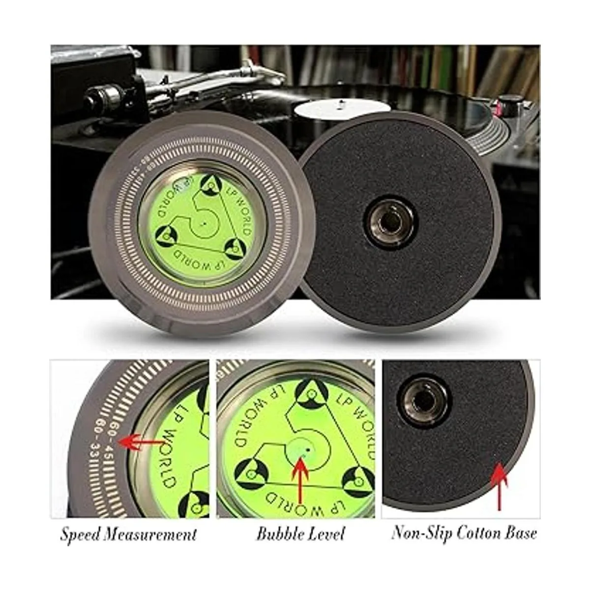 Nivel de burbuja de alta precisión: nivel de burbuja de alta precisión integrado, para probar si la superficie de trabajo está en el nivel horizontal. También muestra la velocidad de rotación del disco LP función de velocidad de rotación solo para 60 Hz.