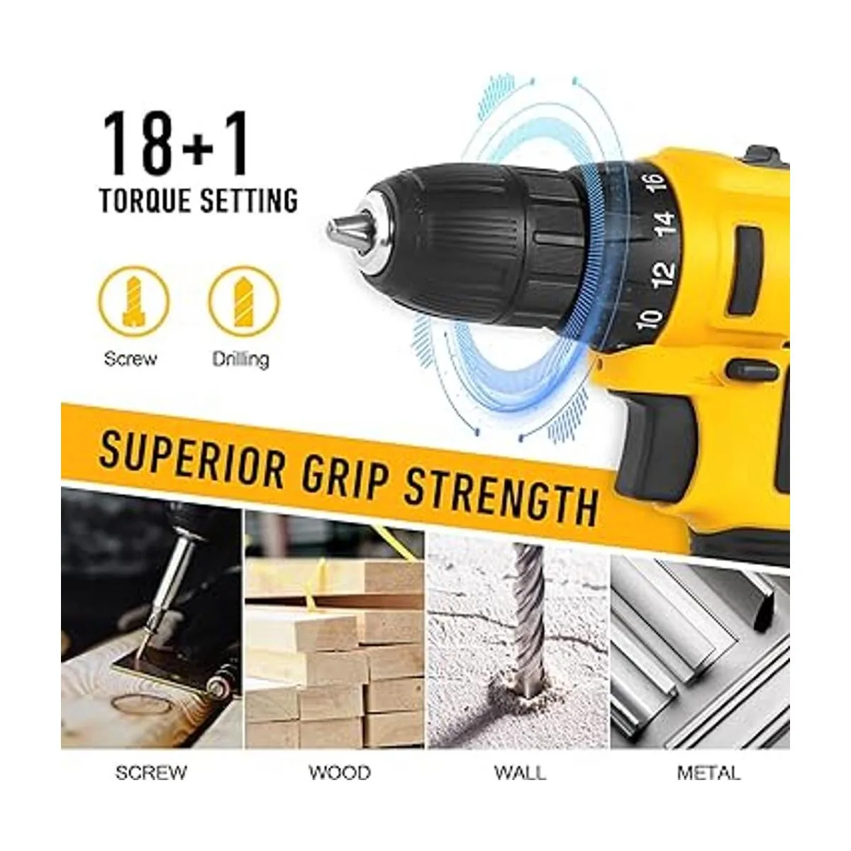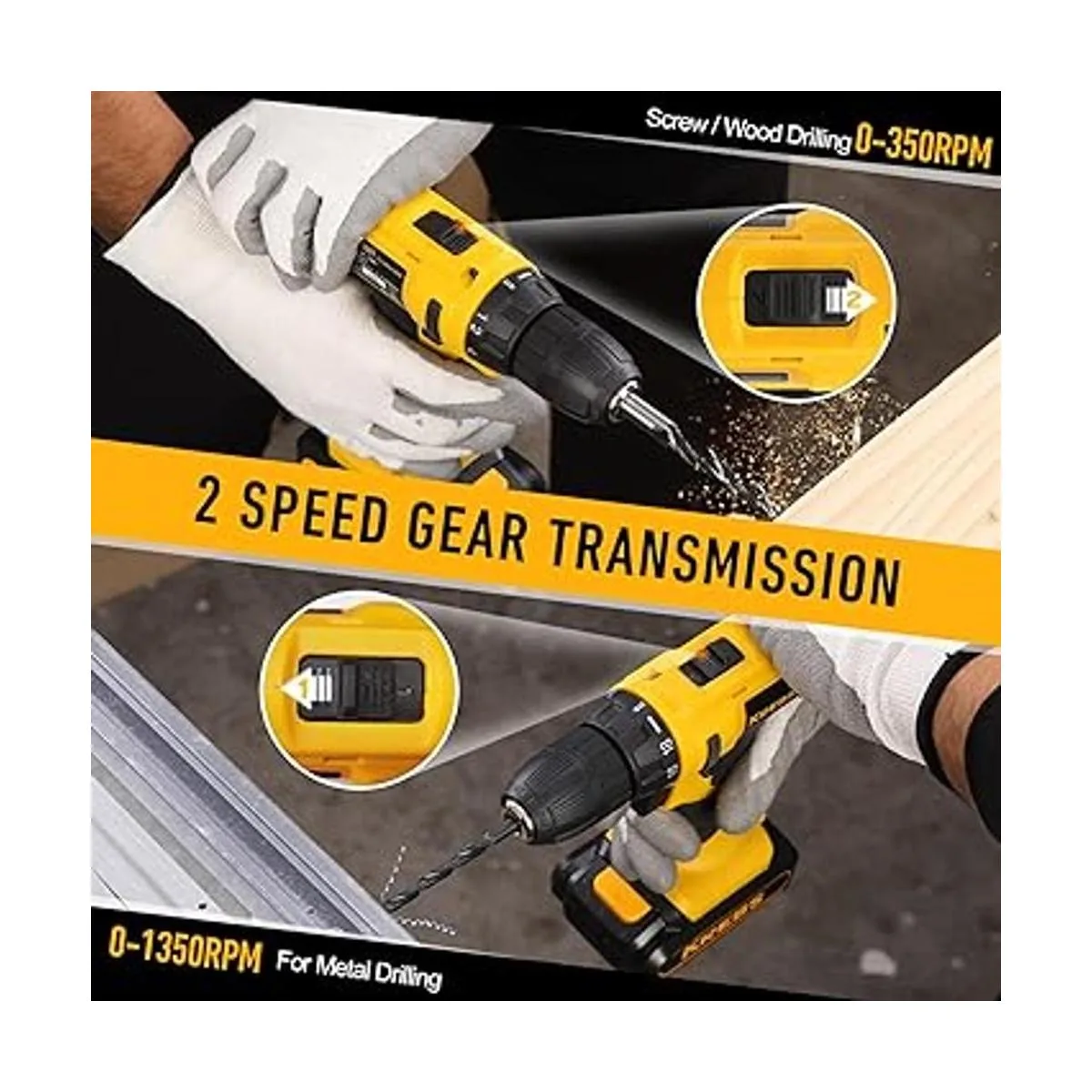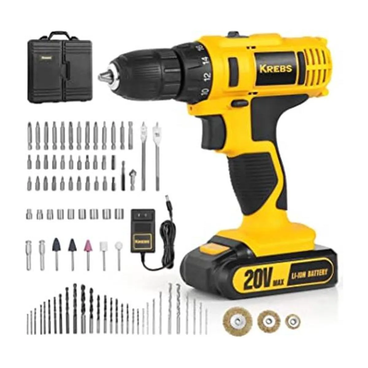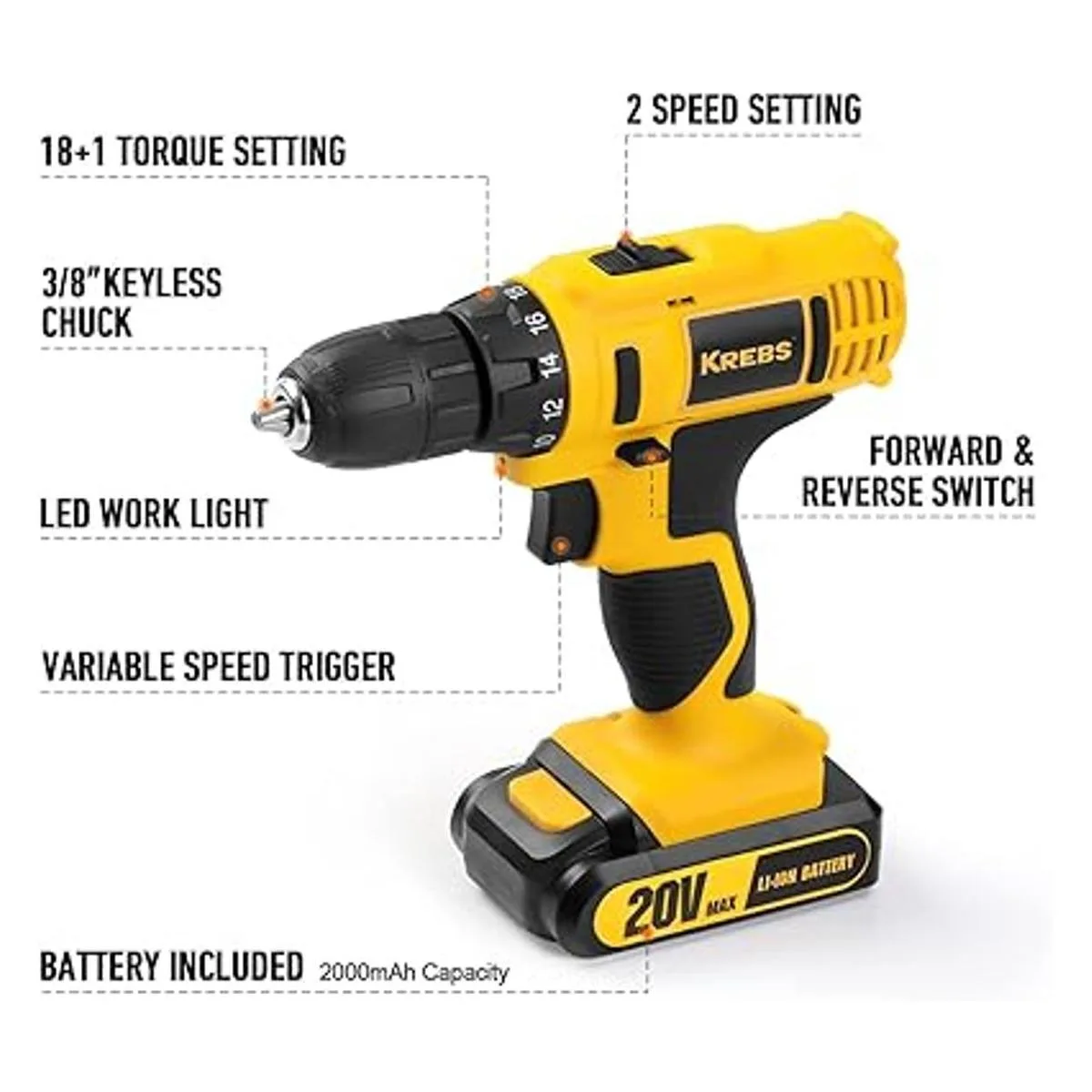 KREBS Power Juego de taladro inalámbrico de iones de litio de 20 V MAX, kit de taladro eléctrico con batería y cargador, portabrocas sin llave de 38 pulgadas, 2 velocidades variables, 19 posiciones y 88 piezas accesorios