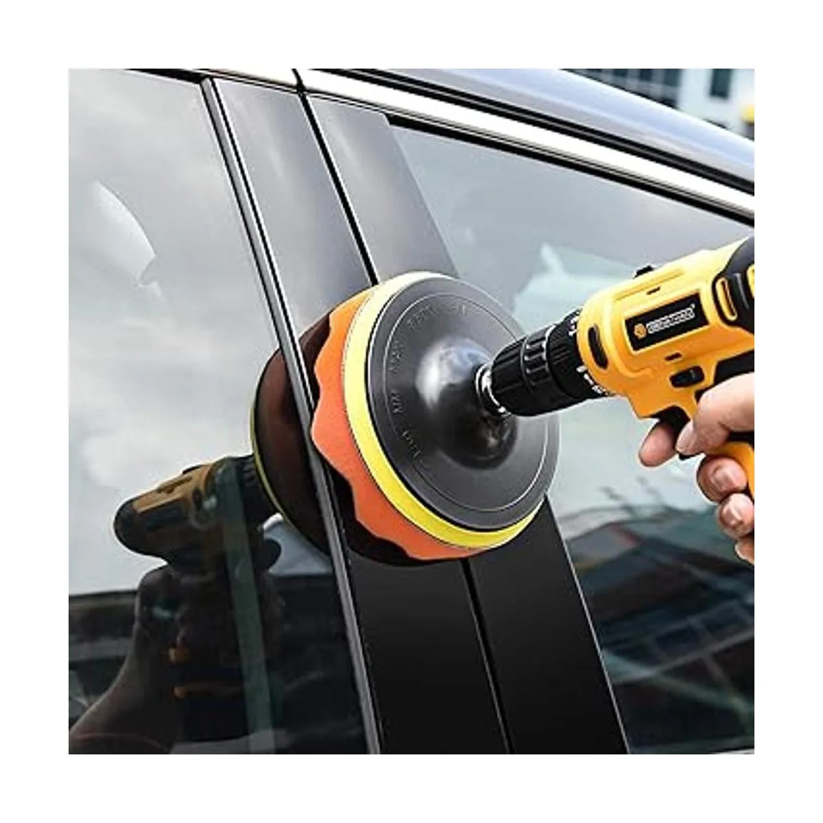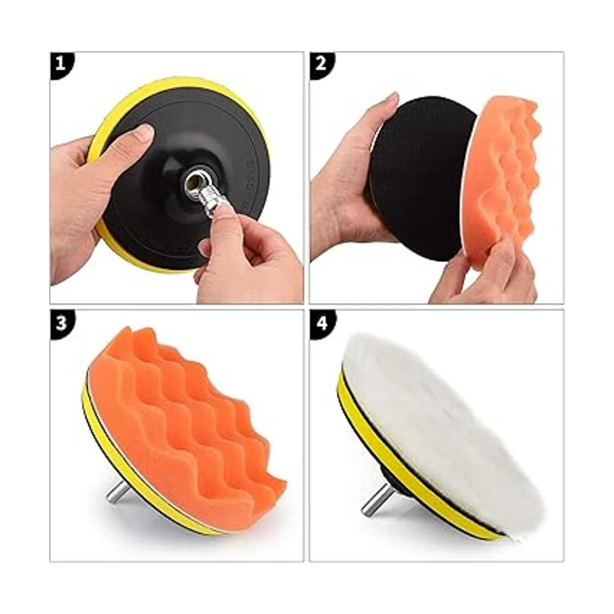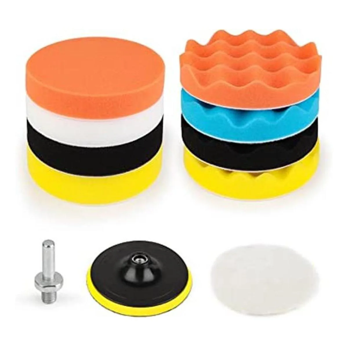 El paquete incluye: 8 almohadillas de pulido de esponja de 5 pulgadas, 1 almohadilla de lana amortiguadora, 1 adaptador de taladro, 1 ventosa.