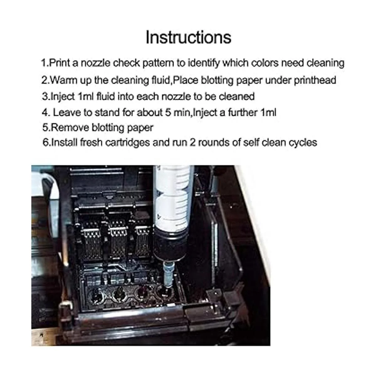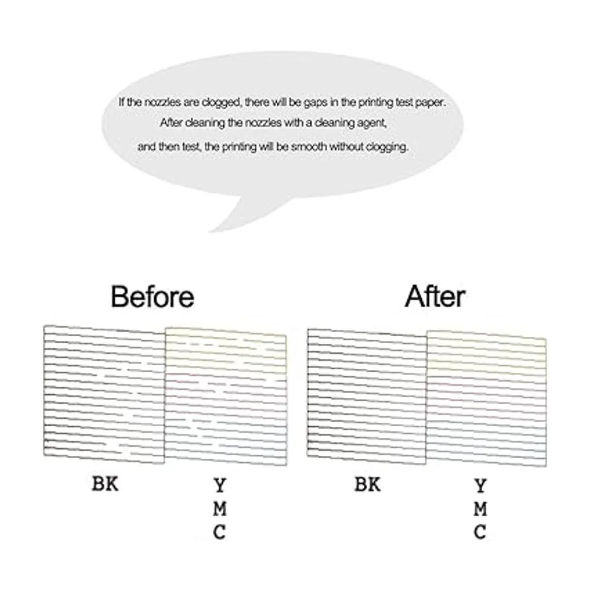 Para resolver el marcado ilegible causado por la obstrucción de la cabeza de impresión rayas verticales, impresión de texto, rayas horizontales o patrones incompletos. Repara impresoras con decoloración, colores/tinta negra sin impresión, impresiones de baja calidad y líneas al imprimir