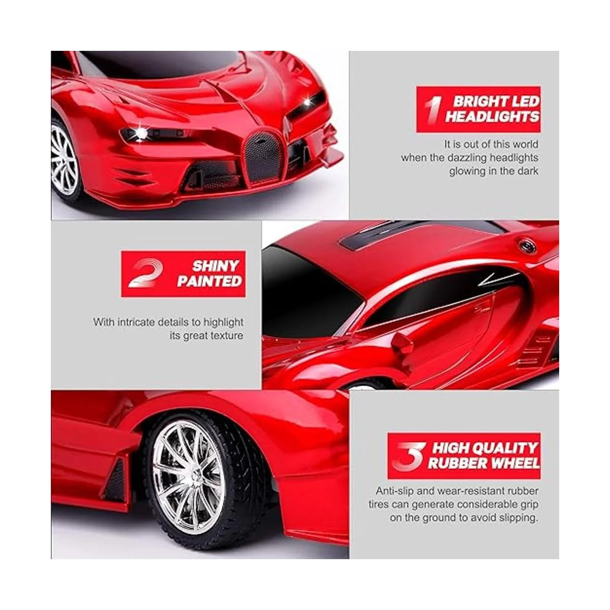 Faro deslumbrante: los faros brillantes brillarán con movimiento hacia adelante. Está fuera de este mundo cuando los deslumbrantes faros brillan en la oscuridad. Las ruedas están hechas de goma de alta calidad para evitar resbalones. Cuerpo de plástico ABS fuerte para evitar arañazos.