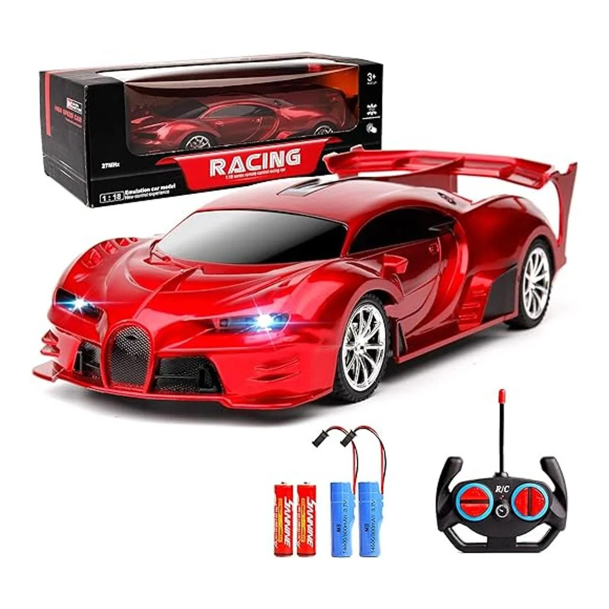 Coche rápido recargable de 1/18 para niños: equipado con dos baterías recargables. Se puede utilizar alrededor de 2030 minutos para cada batería después de cargarse completamente 4060 minutos para 2 baterías que dependen de la operación. La velocidad del coche puede alcanzar hasta 11.2 mi por hora para una experiencia de conducción emocionante.