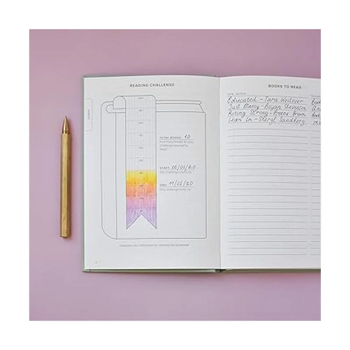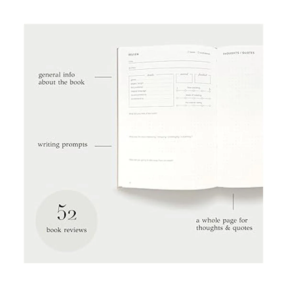 Espacio para 52 reseñas de libros con mucho espacio para escribir pensamientos y citas. Comprueba y completa con orgullo varios desafíos y listas de lectura: libros que he leído, terminado, favoritos, no terminado, cuaresma, prestado y más