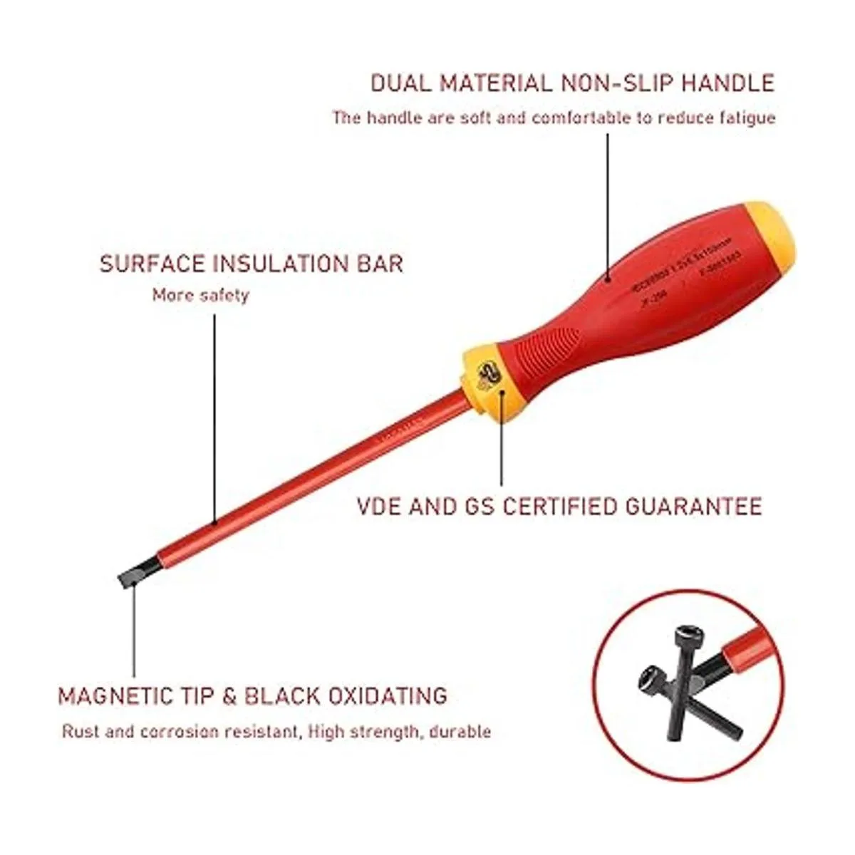 Material de alta calidad: el juego de destornilladores aislados KUNTICA adopta una hoja de acero al cromo vanadio, más fuerte y más duradero que el acero estándar, ofrece un par de torsión más fuerte y resistencia para evitar que se desprenda. Punta de destornillador negra para mayor protección contra la corrosión y ajuste preciso en el cierre.