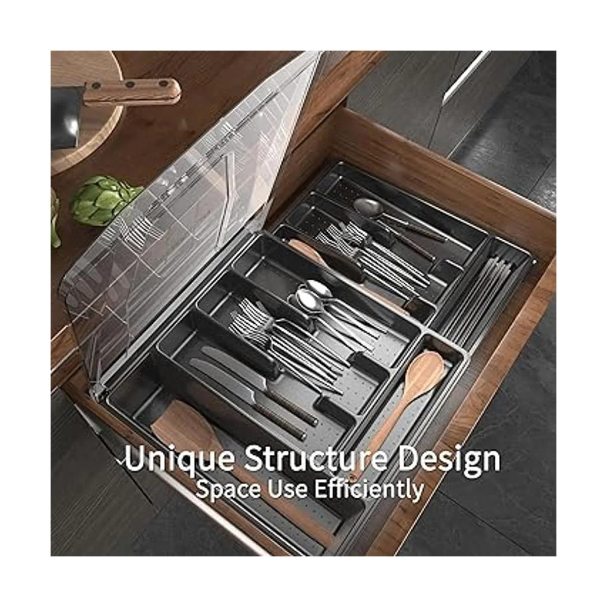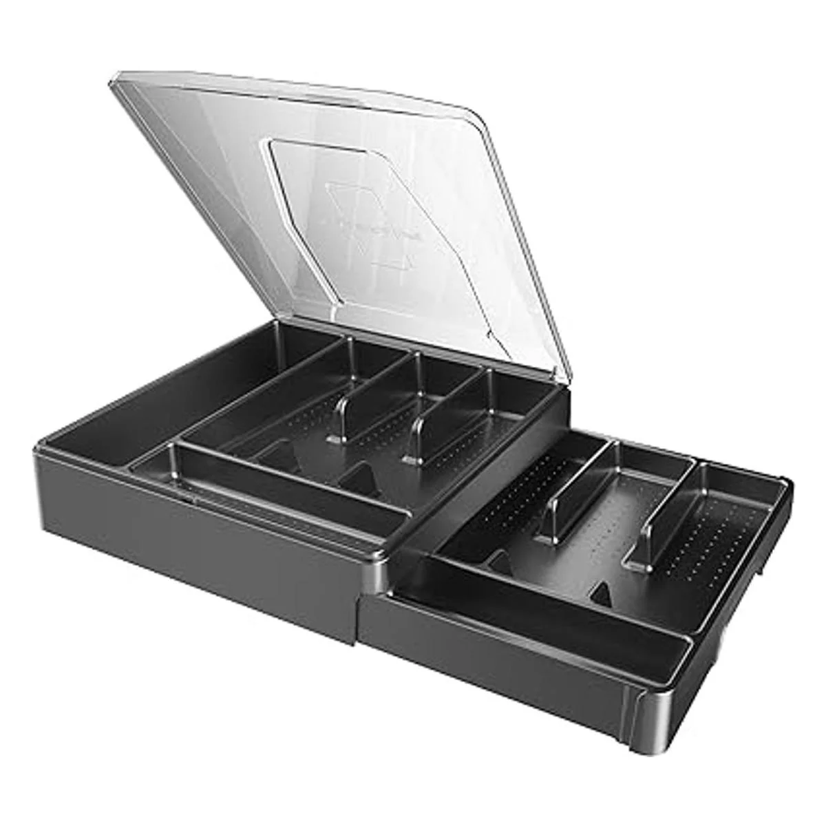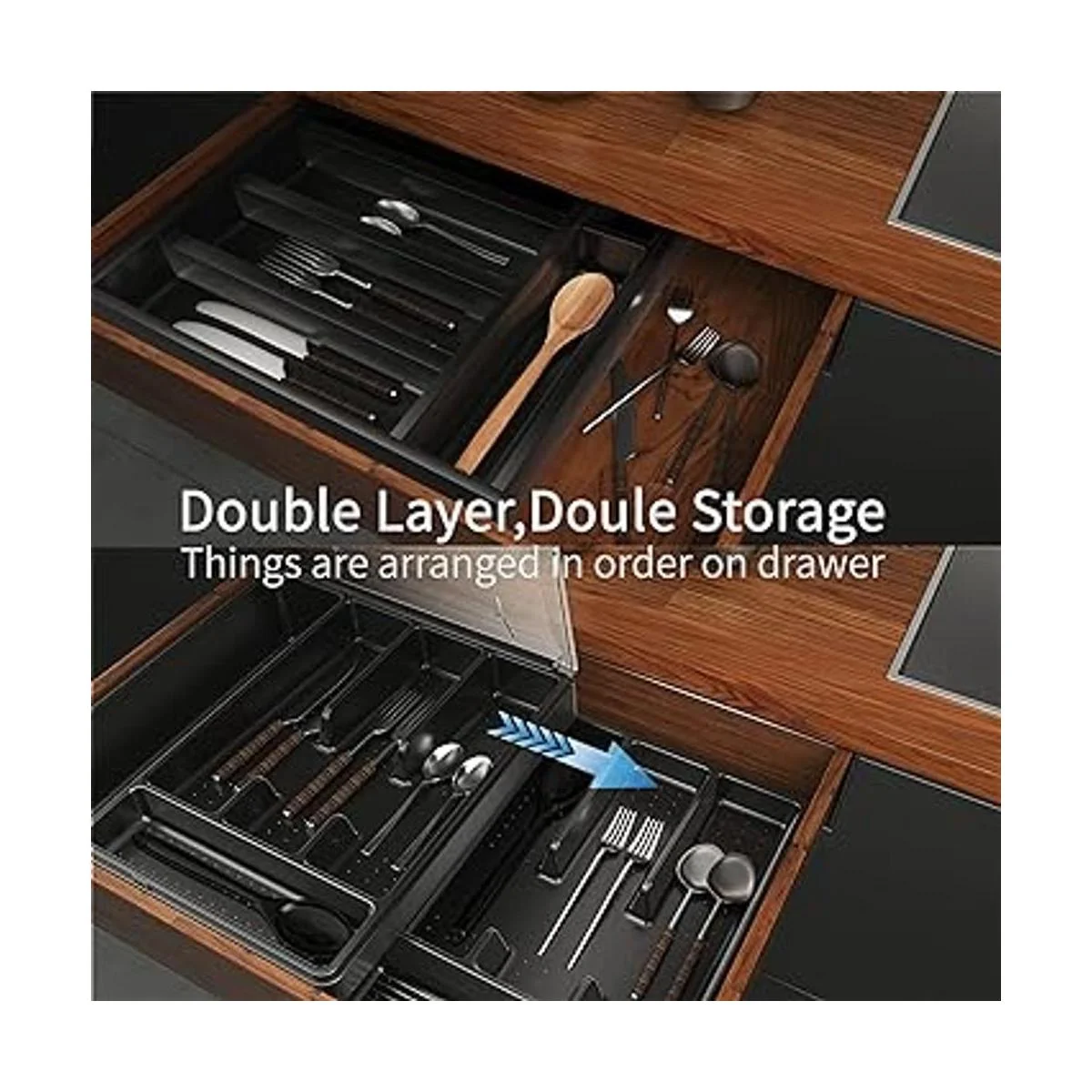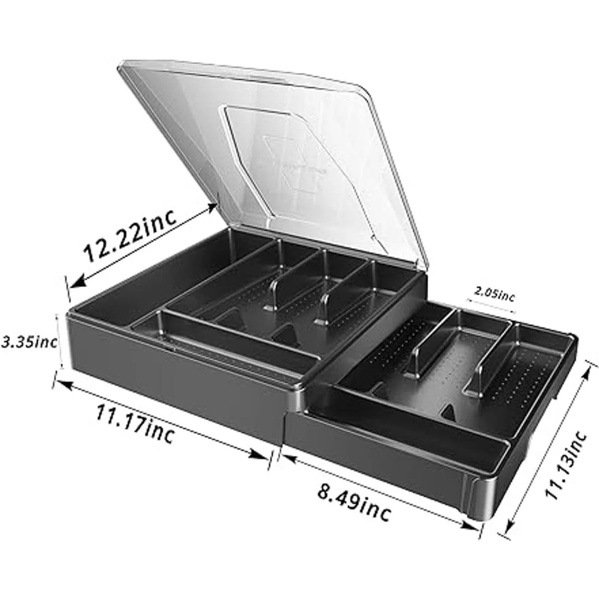 Kurberson Bandeja de cubiertos de doble capa con tapa, organizador de cajones para bandeja de utensilios, soporte de almacenamiento de cubiertos con cubierta, color negro