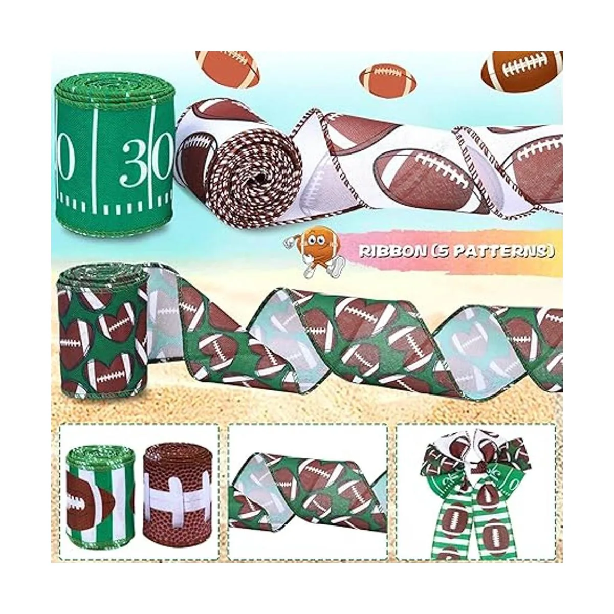Cantidad abundante: el paquete incluye 5 rollos de cintas de borde con alambre en total 5 estilos, cada rollo mide 5 yardas de largo, 2.5 pulgadas de ancho, suficiente longitud con patrones de fútbol impresos, perfecto para hacer algunas manualidades de corona o utilizar para envolver regalos.