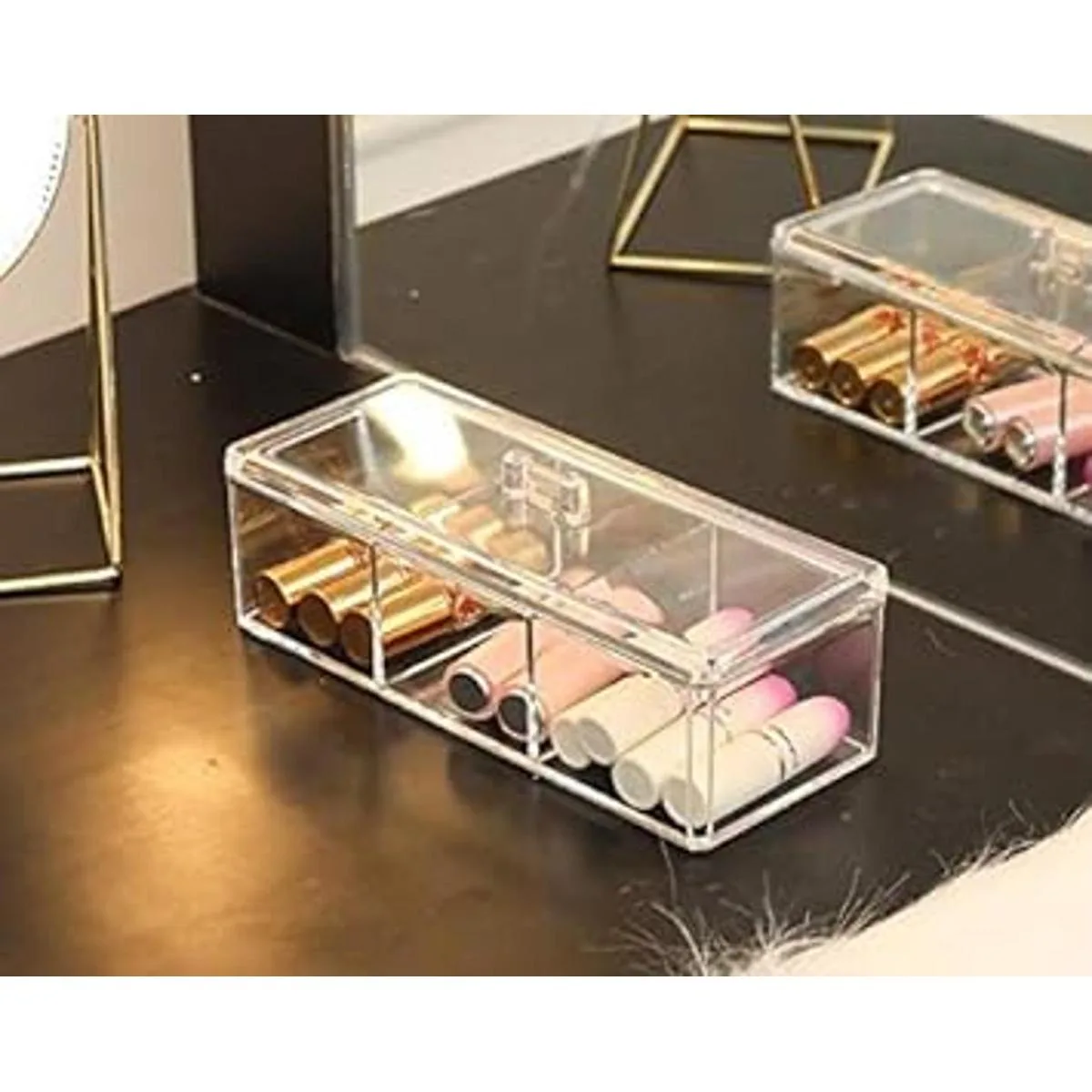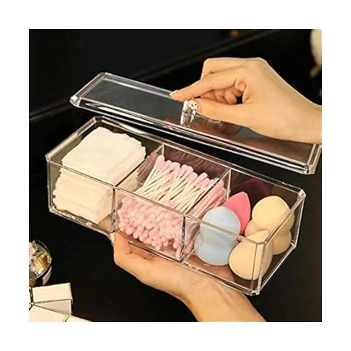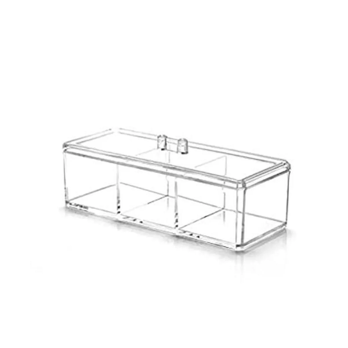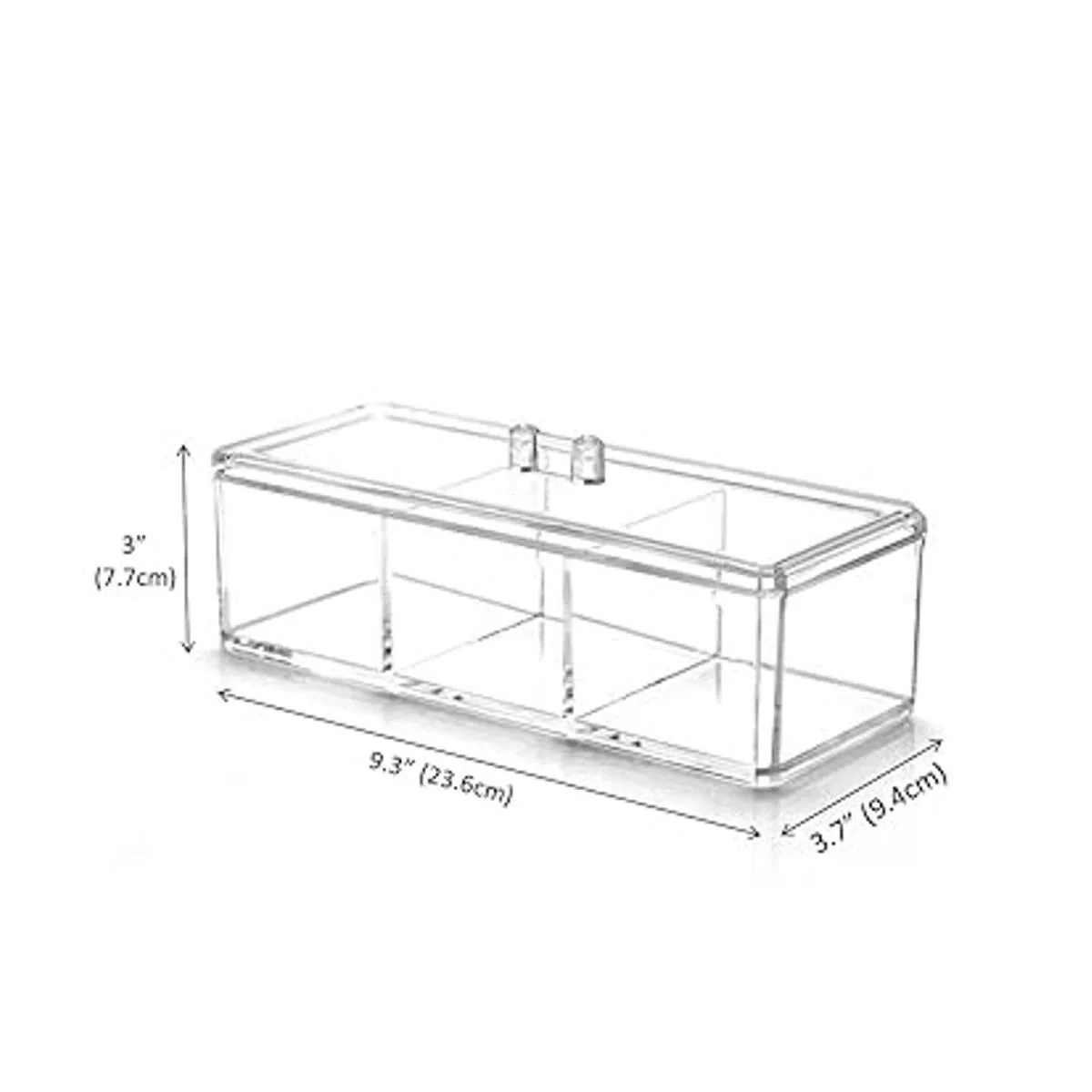 Almacenamiento compacto: Dimensiones: 3.7 pulgadas de ancho x 9.3 pulgadas de largo x 3 pulgadas de alto con tapa. Este recipiente es un nivel con 3 particiones separadas de acrílico unidad de almacenamiento, con una tapa. Es espacioso para organizar diversos artículos: productos de maquillaje, joyas, suministros de oficina, suministros de manualidades y otros objetos pequeños.