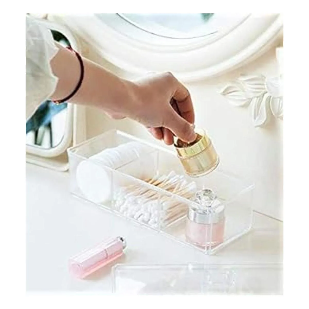 Calidad prémium: hecho de plástico duradero sin cloro; parece vidrio pero no se rompe; fácil cuidado: limpiar con agua y jabón suave o limpiar con un paño húmedo. Además, su cuerpo transparente te permite ver lo que almacenas en el interior. Es ideal para almacenar y organizar hisopos de algodón, qtips, bolas de algodón, óvalos y redondos, aplicadores de maquillaje y esponjas cosméticas, cuñas, jabones de invitados, bombas de baño, bolas, sales y mucho más.