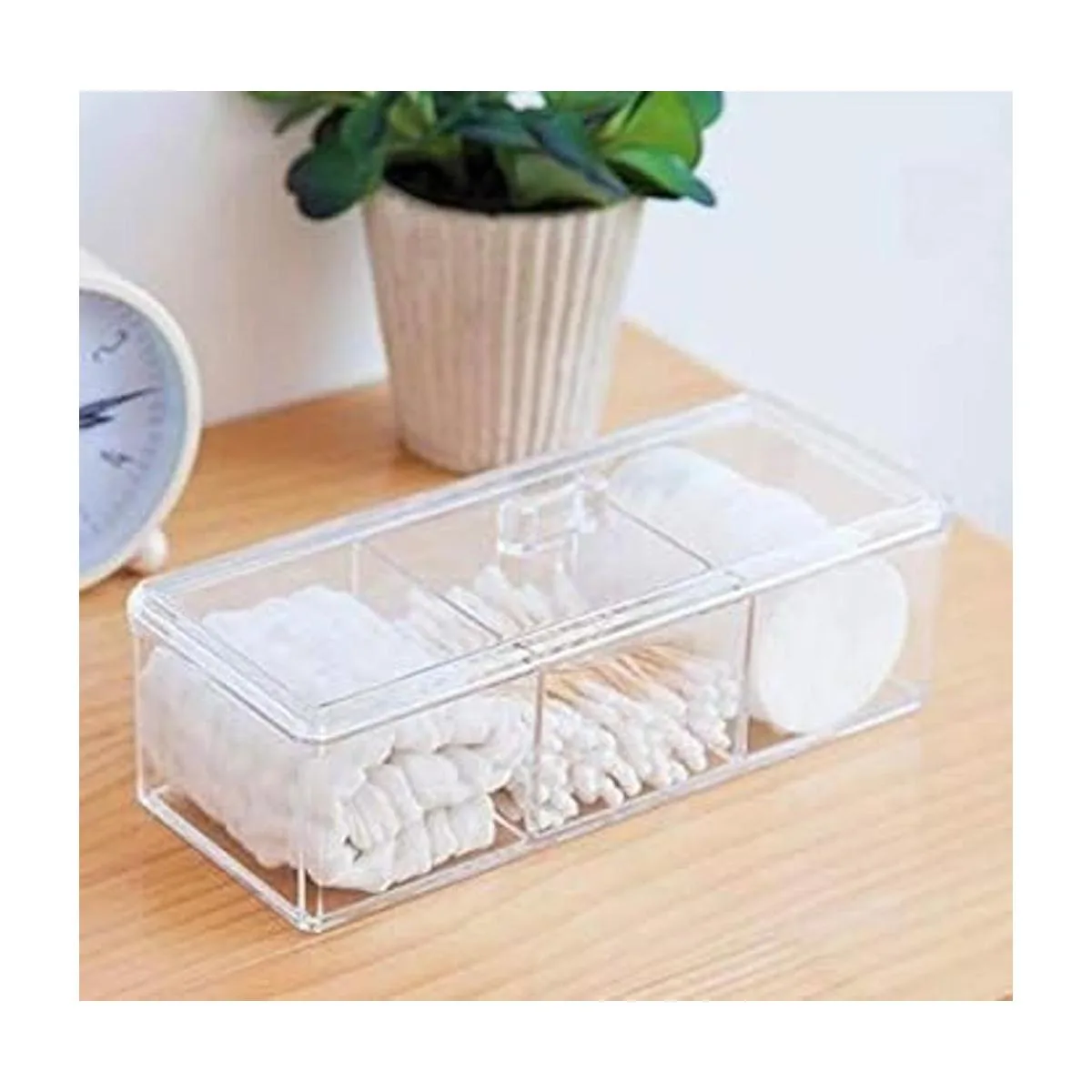 KW Collection Almohadillas cuadradas de algodón acrílico, soporte para hisopos de gasa, organizador de dispensador de punta Q, recipiente de almacenamiento, contenedor de baño, caja de hilo dental 9.3 x 3.7 x 3 pulgadas, 1 nivel, 3 particiones, transparente