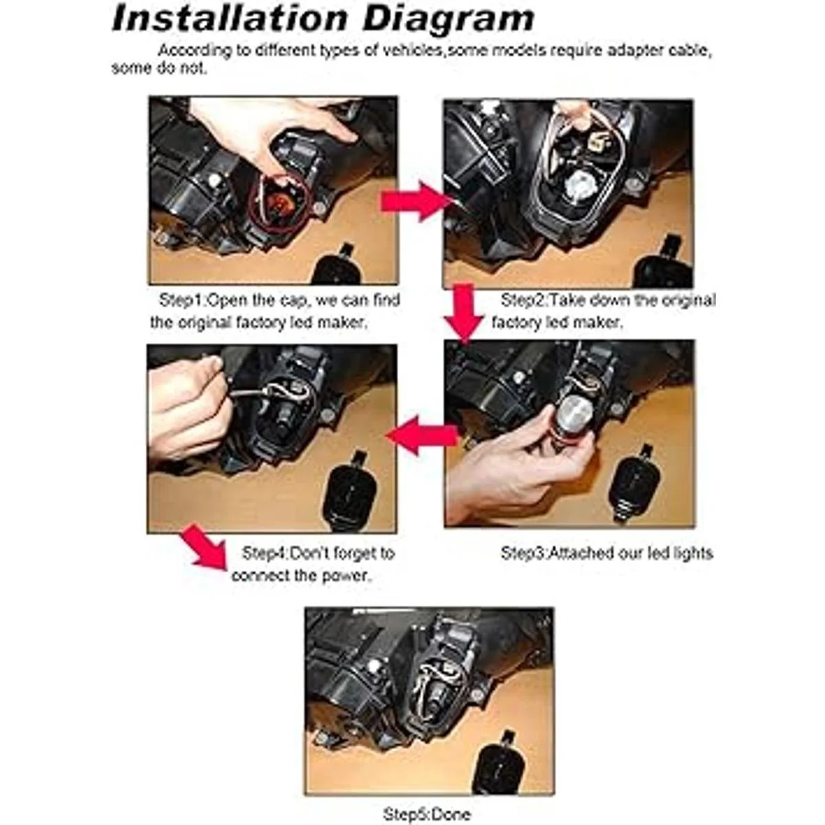 5 W por bombilla, 10 W por par. Actualiza a los chips, te ofrece la alta potencia y la tecnología LED más brillante, proporciona 3 veces el brillo de la hermosa luz blanca de 6000 K que las bombillas originales.