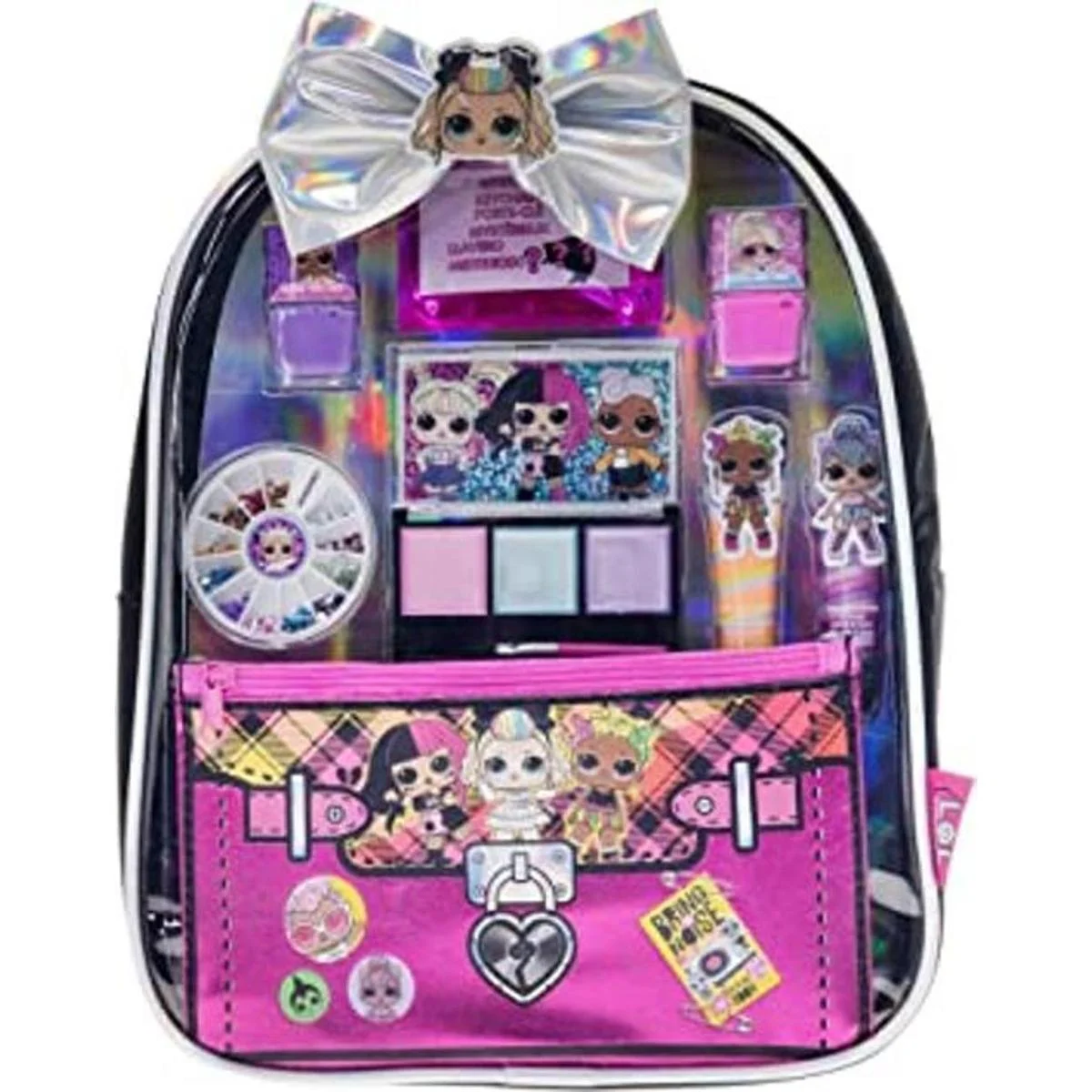 El juego incluye: surtido de 2 tubos de brillo de labios, 1 caja de gemas de uñas, 1 llavero misterioso, 2 esmaltes de uñas y 1 brillo de labios compacto, todo empaquetado en una mochila.