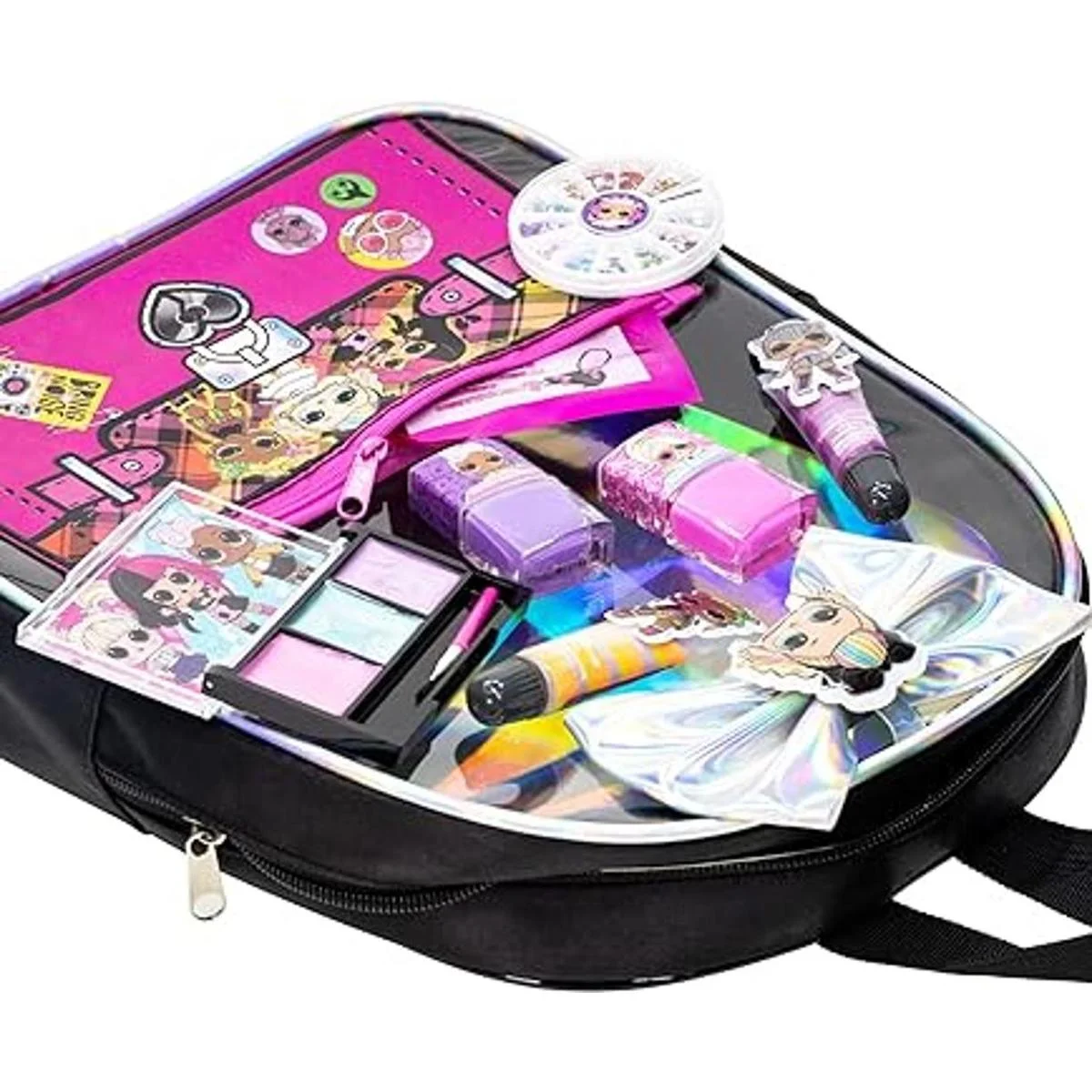 Da rienda suelta a su creatividad: este increíble juego de cambio de imagen contiene todo lo que necesitará para crear un aspecto deslumbrante de belleza. Con múltiples colores de esmalte y gemas de uñas, brillos de labios y más, se divertirá mucho glamuroso. Y la mejor parte es que puede llevar todos estos elementos esenciales de belleza con ella sobre la marcha almacenándolos en su nuevo L.O.L. Mochila de maquillaje