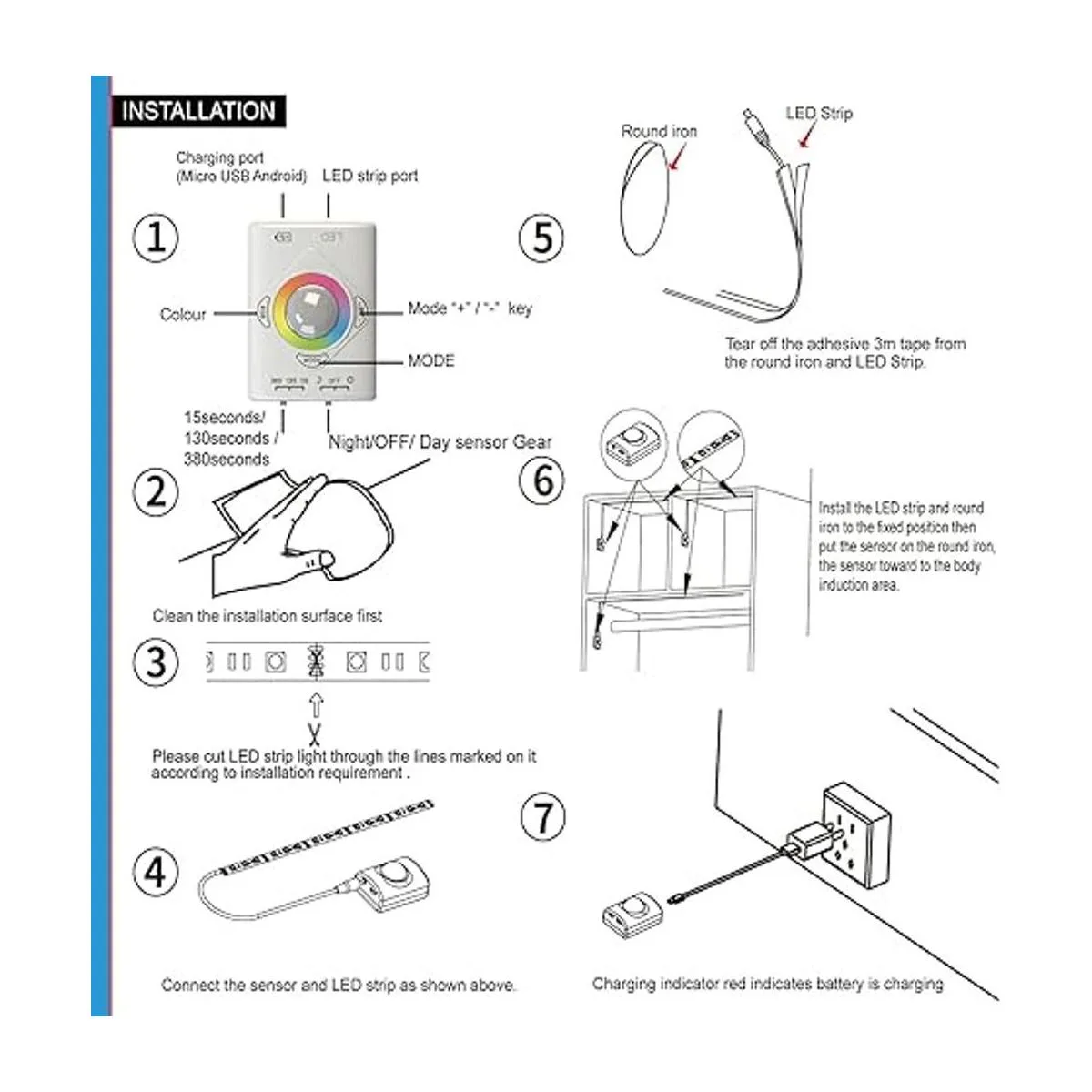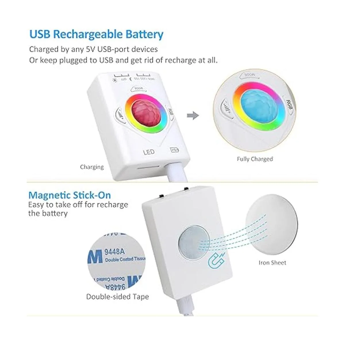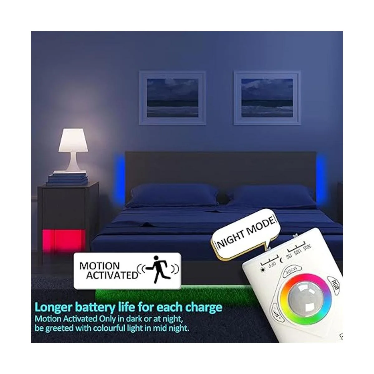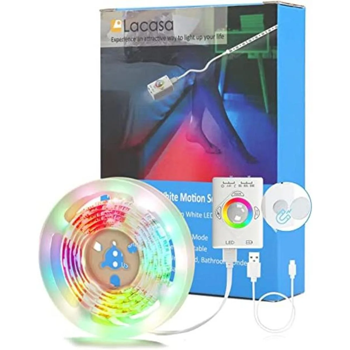 Lacasa Tiras LED con sensor de movimiento, RGB y blanco cálido debajo de la cama, tira de luz nocturna de 3.28 pies, 14 colores y 6 modos cambiantes, luz de estado de ánimo regulable, para dormitorio, baño, bar, armario, batería recargable USB