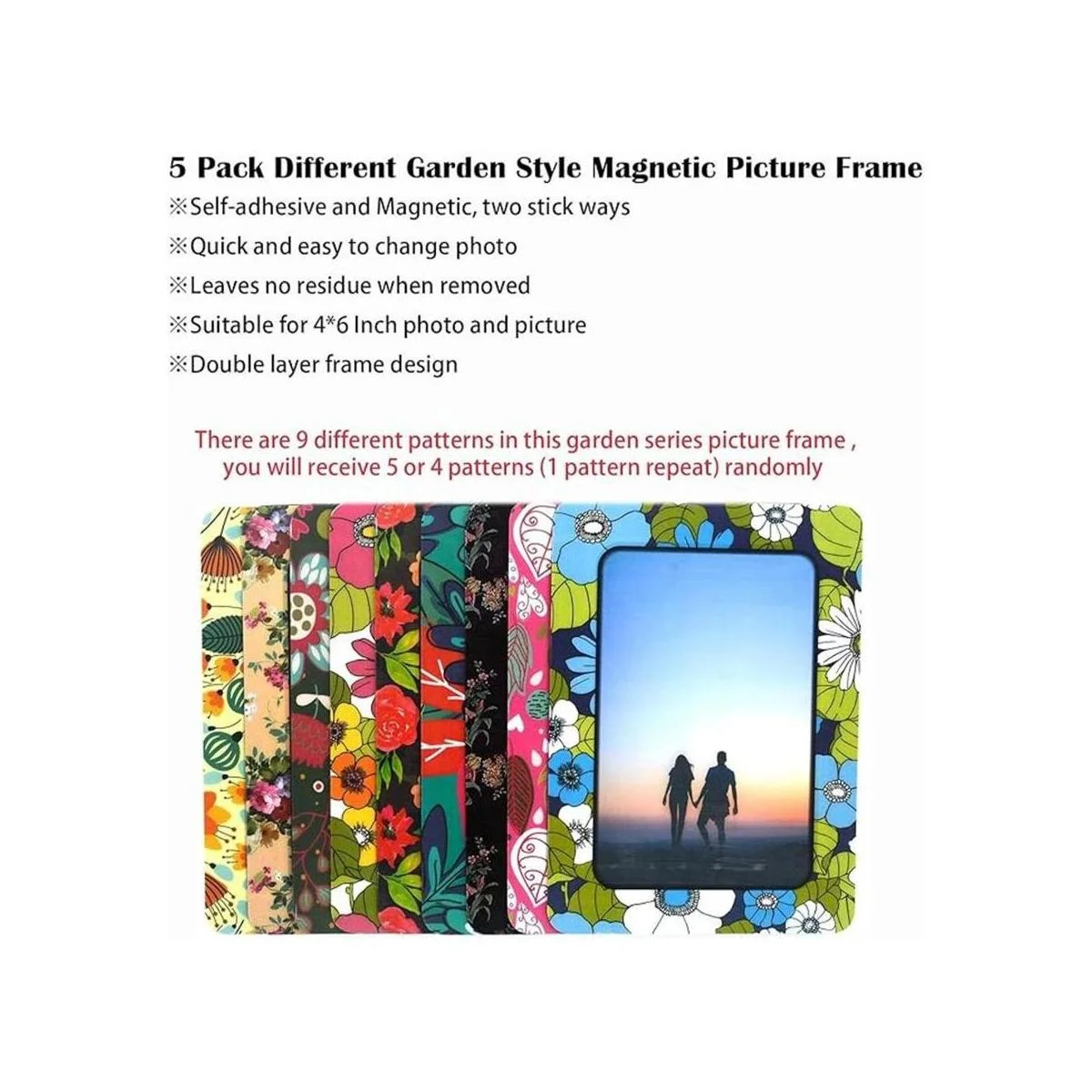 Paquete de 5 para fotos de 4 x 6: paquete de 5 marcos magnéticos estilo jardín, perfecto para fotos de 4 x 6 pulgadas, tamaño total del marco 5.27 x 7.24 pulgadas, área interior visible de 3.74 x 5.71 pulgadas, grosor 0.079 in. Se puede utilizar en pared ventana, puerta, armario, tablón de anuncios, nevera, pizarra blanca y otras superficies de metal o superficie lisa y sólida.