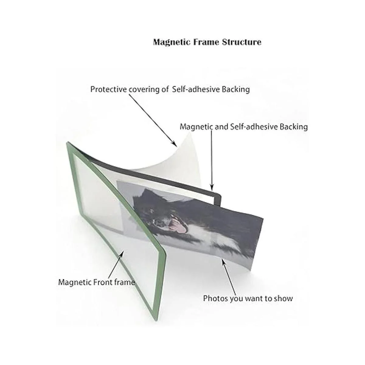 Características: autoadhesivo y magnético, dos formas de pegar. Rápido y fácil de cambiar de foto. No deja residuos cuando se retira. Adecuado para fotos e imágenes de 3.9 x 5.9 in. Diseño de marco de doble capa. Retira la película protectora transparente en la parte delantera del marco de la imagen cuando se utiliza