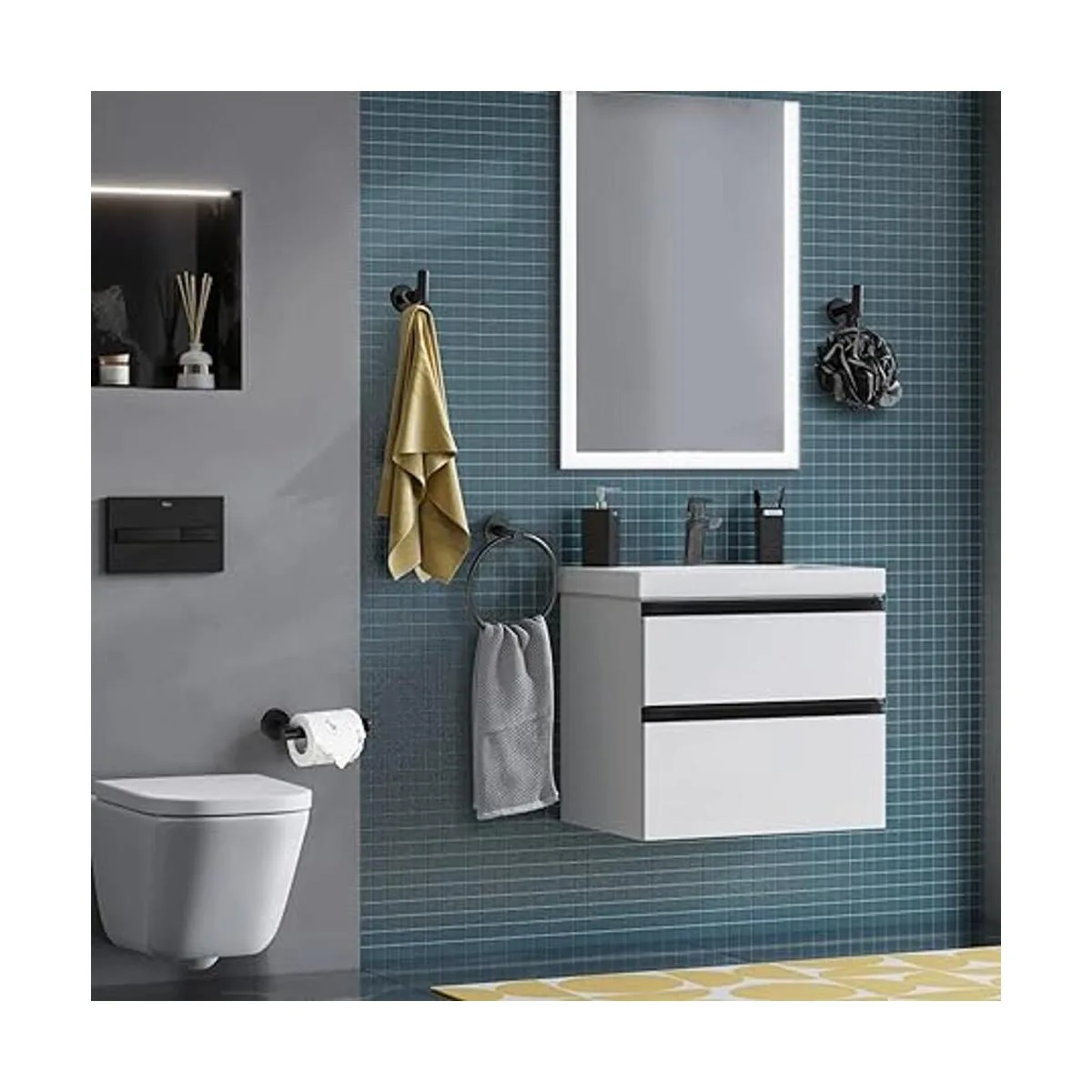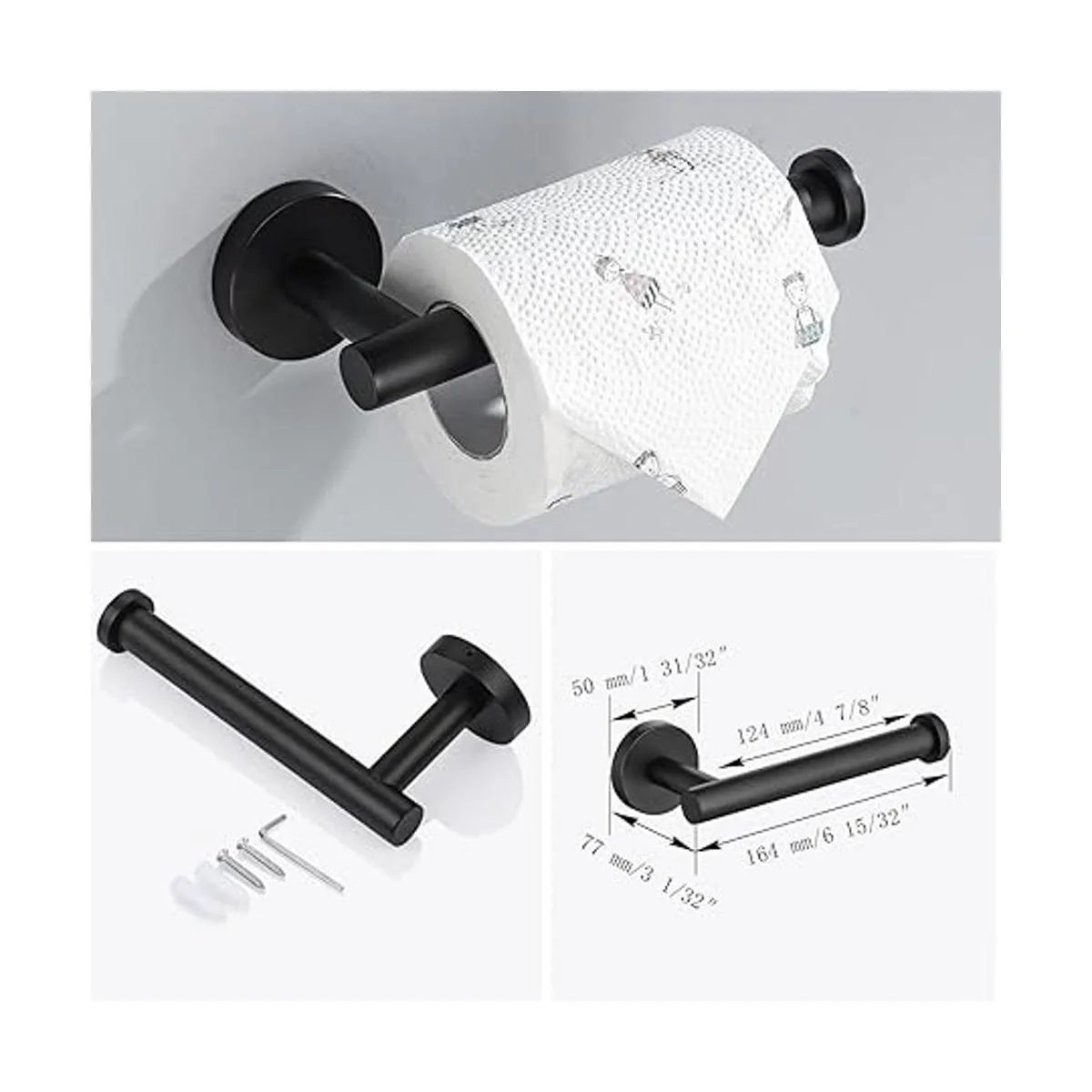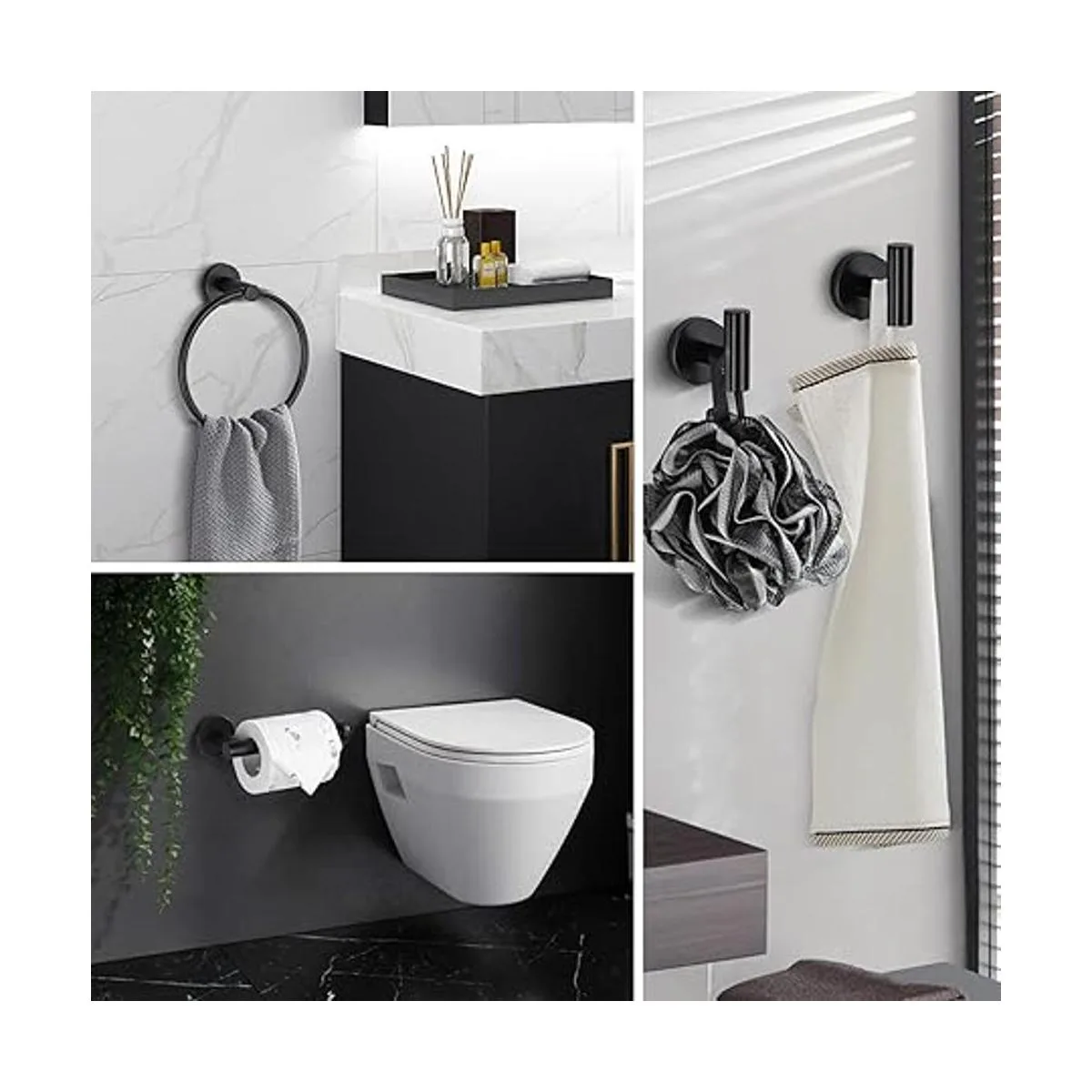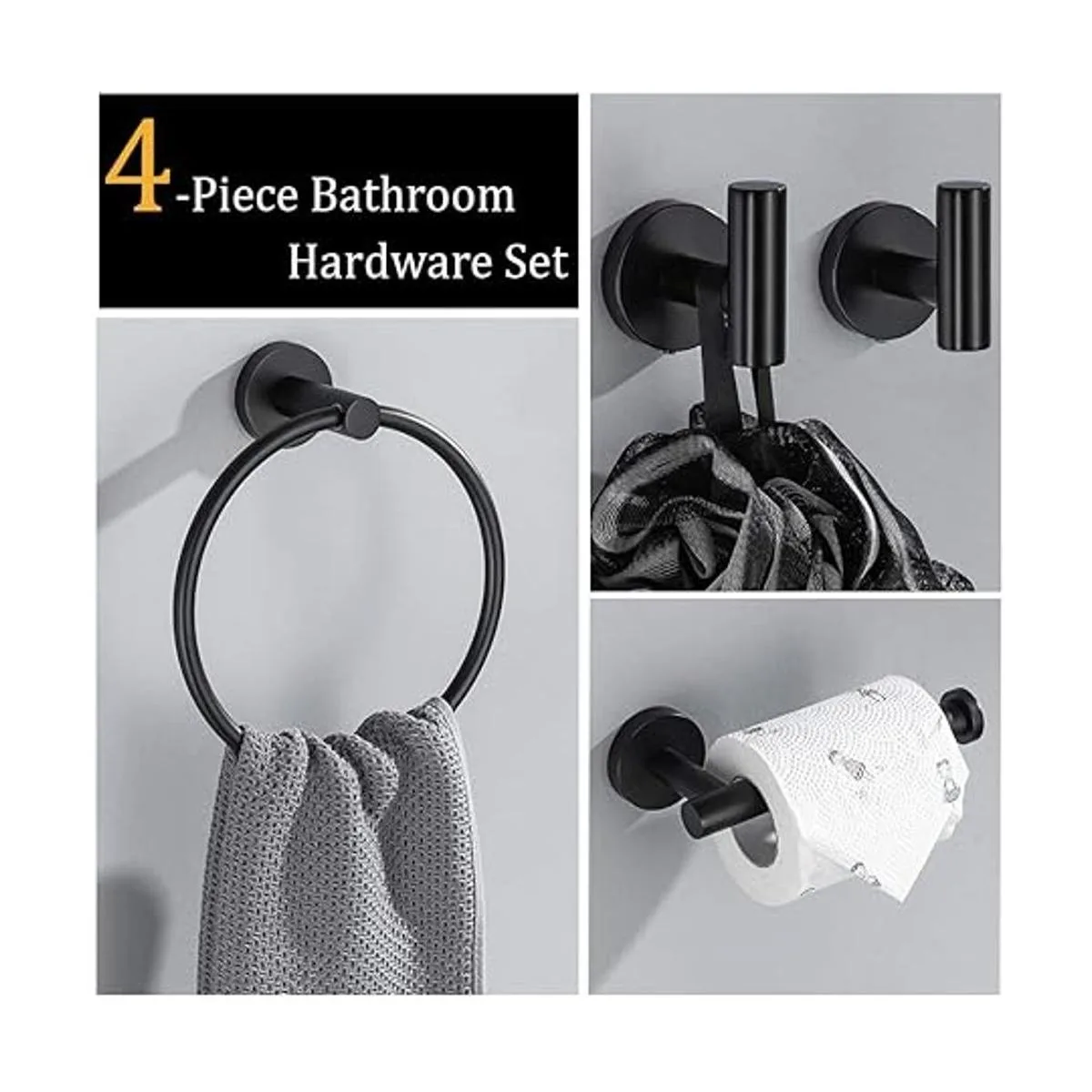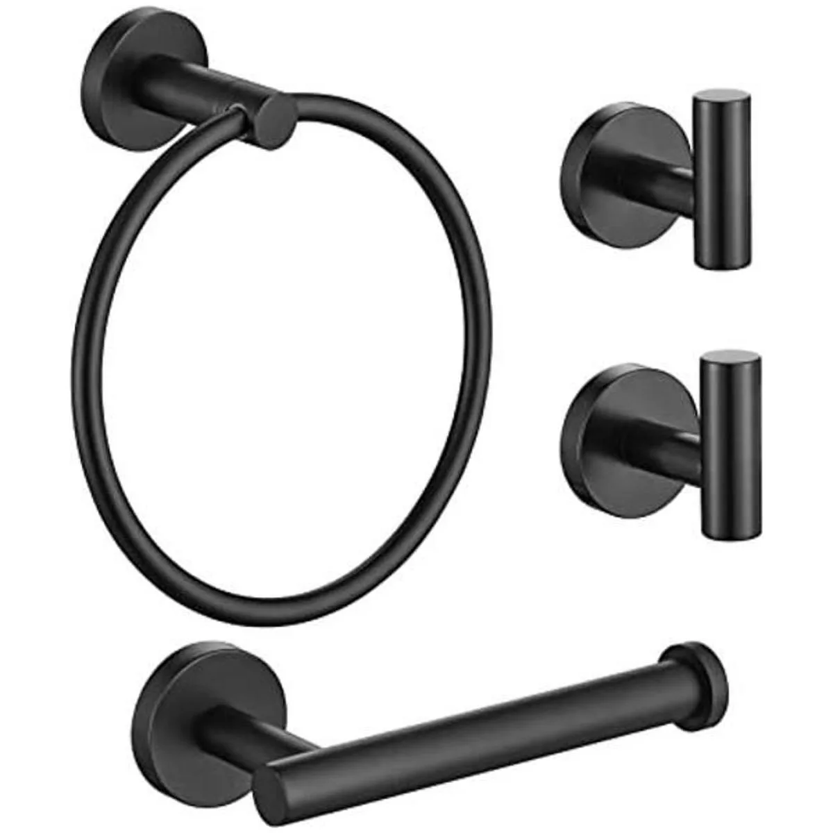 Lairuier Juego de accesorios de baño, acero inoxidable negro mate, 4 piezas, incluye soporte de papel higiénico para toalla de mano y 2 ganchos para toallas de bata, accesorios de montaje en pared para baño, Q1MP4BK