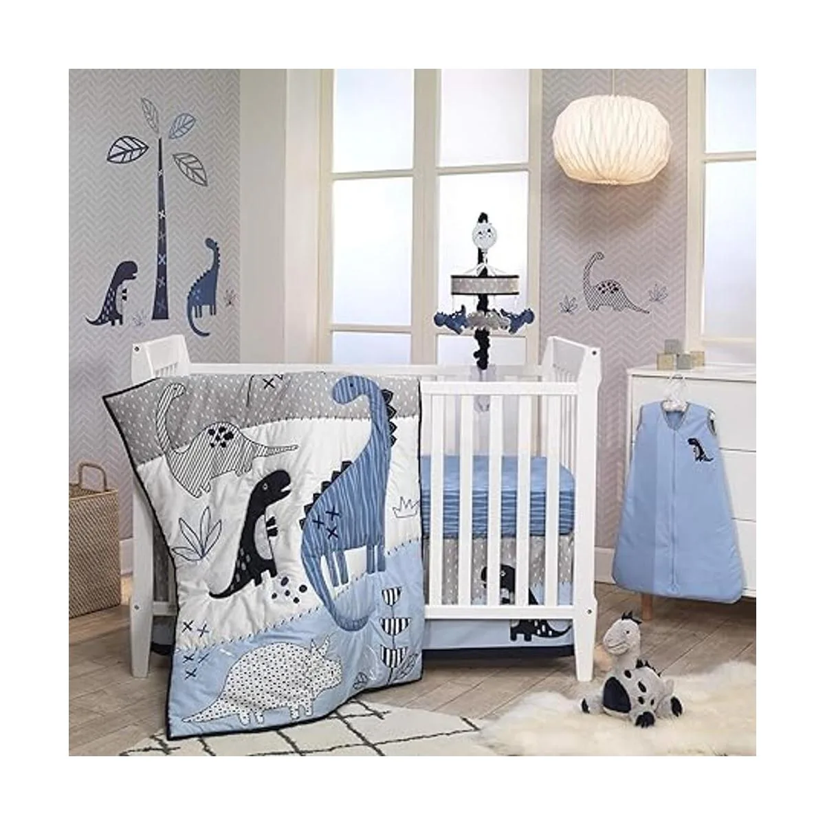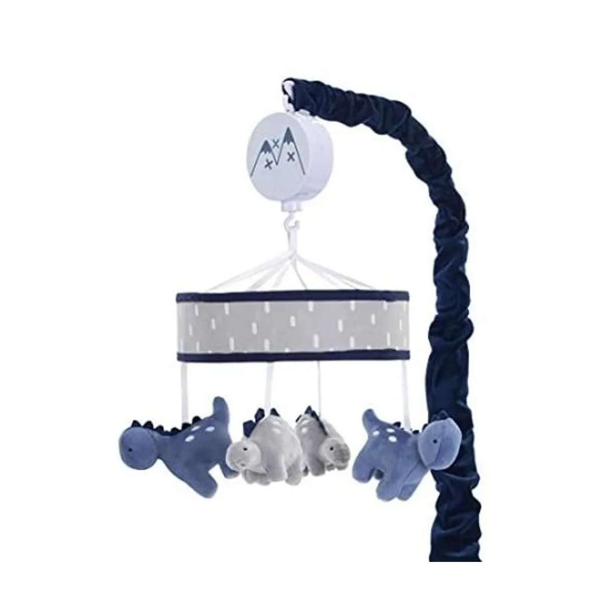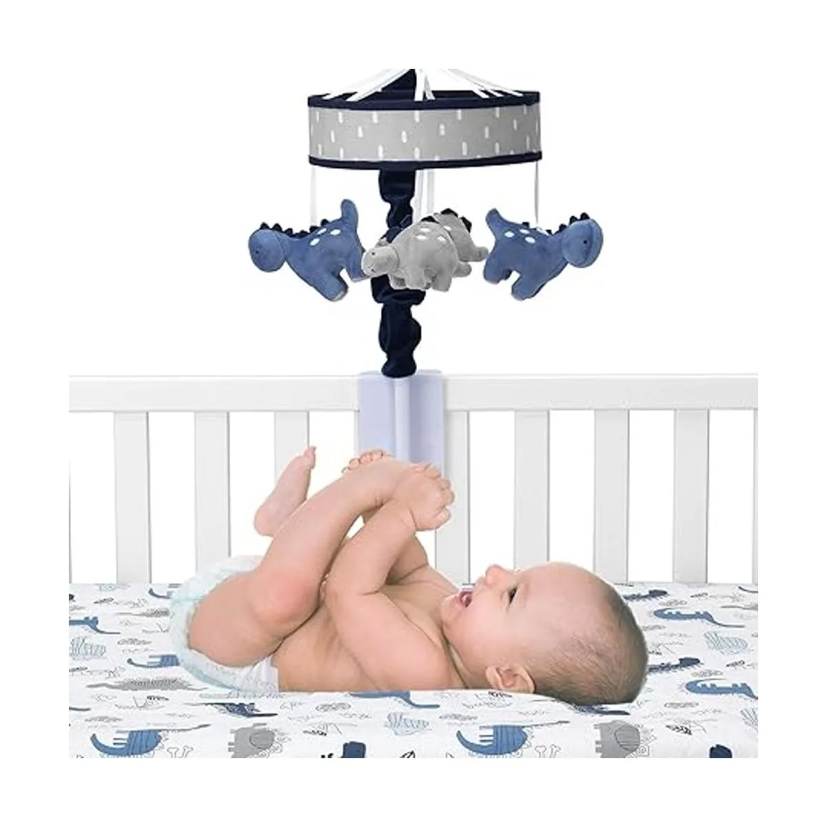 Colgando dinosaurios de terciopelo azul bebé y gris acero giran alrededor del móvil de la cuna musical bajo un anillo de banda ancha para proporcionar entretenimiento y calmar a los bebés para dormir.