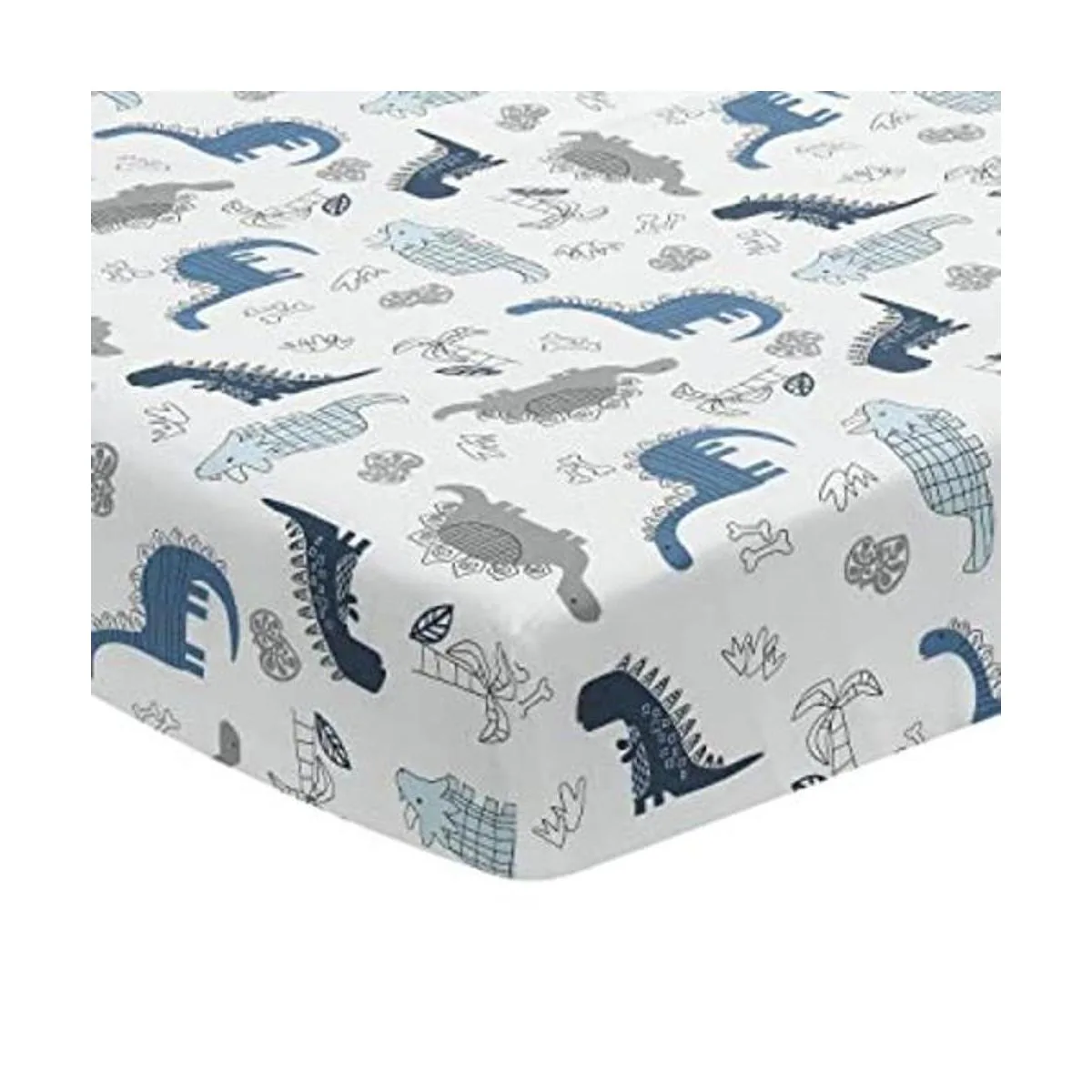 Esta sábana de cuna de algodón 100 transpirable para bebé se lanza con diferentes dinos en un suelo blanco.