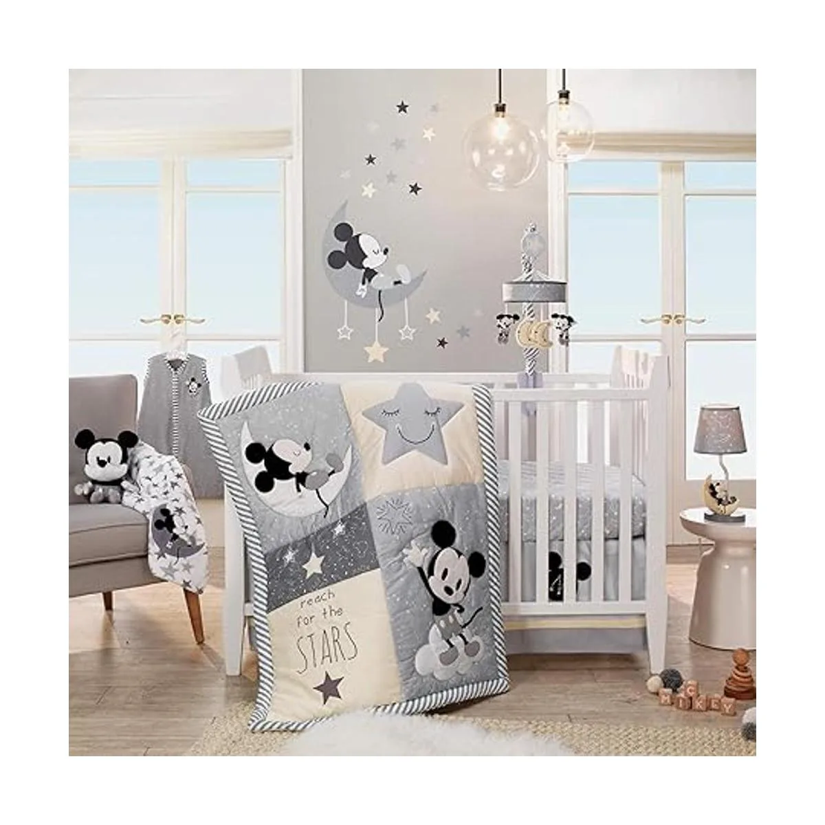 Mickey está rodeado por una variedad de estrellas de varios colores en varios tamaños.
