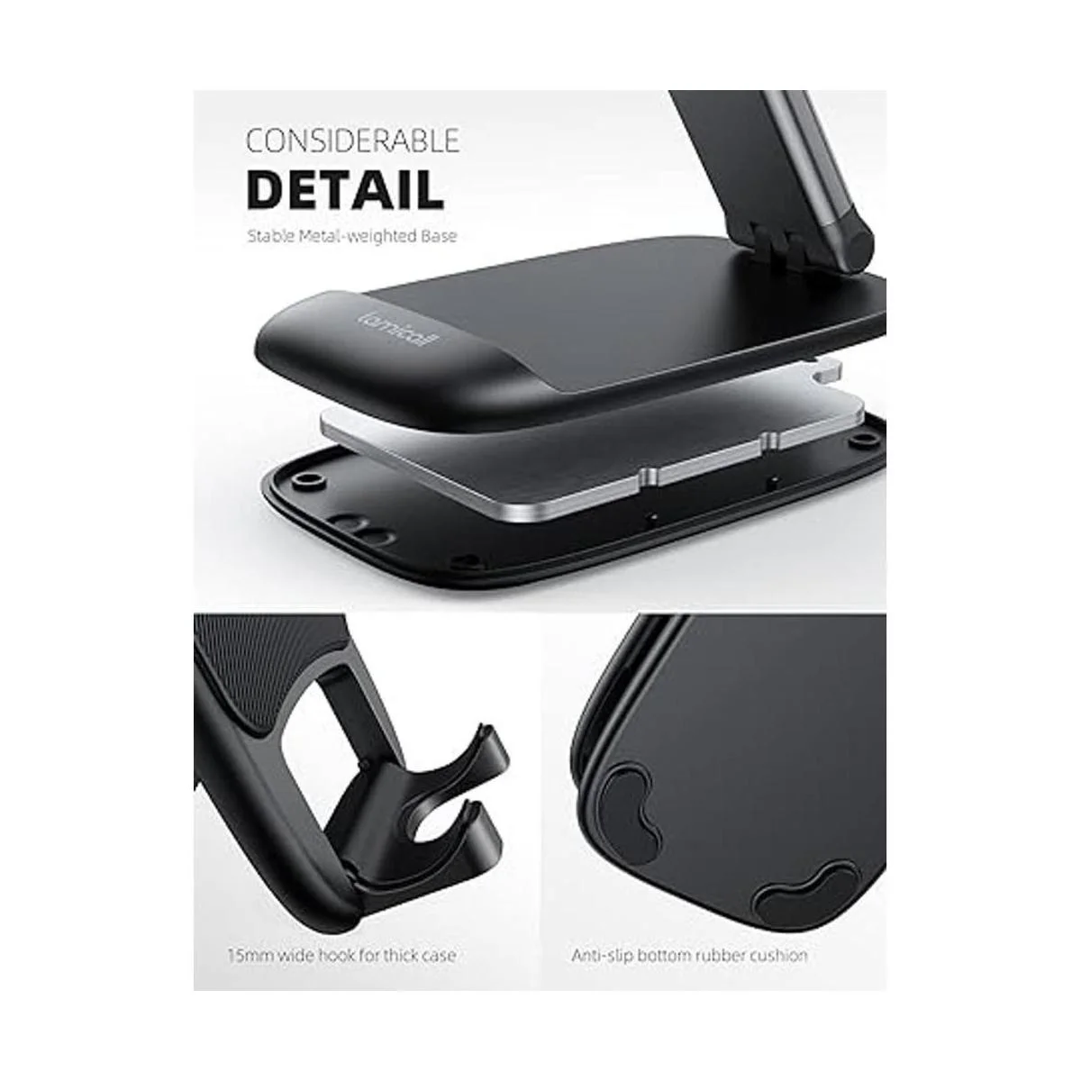 Compatible con fundas gruesas: este soporte para teléfono celular funciona para teléfono con funda gruesa de hasta 0.71 pulgadas de grosor. Las alfombrillas de silicona ampliadas y gruesas antideslizantes y antiarañazos en el respaldo, los ganchos y los pies de la base protegen tu teléfono móvil de deslizamientos y arañazos. Materiales duraderos y la superficie lisa de alta precisión evitan que este soporte de teléfono se raye y se rompa incluso después de un uso a largo plazo.