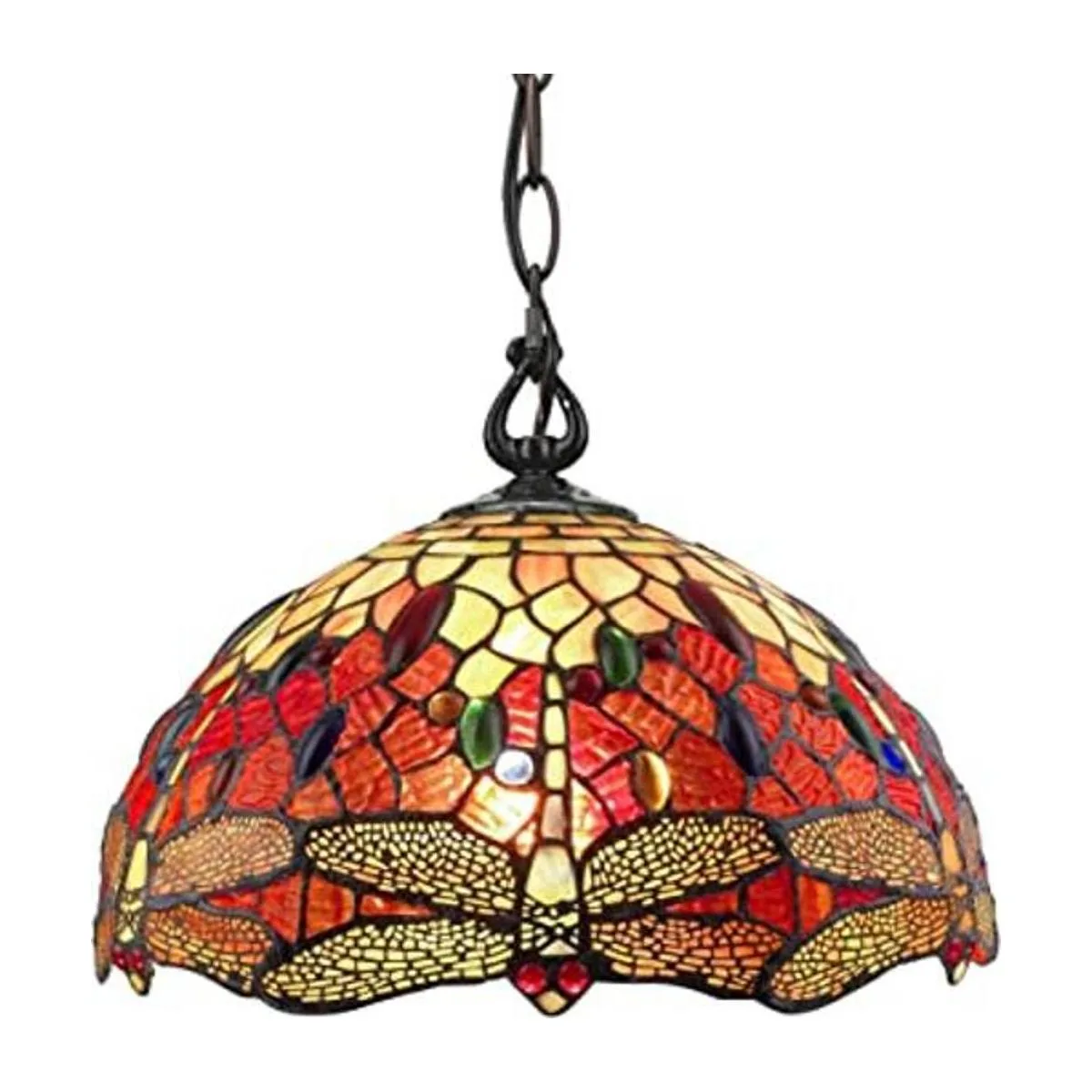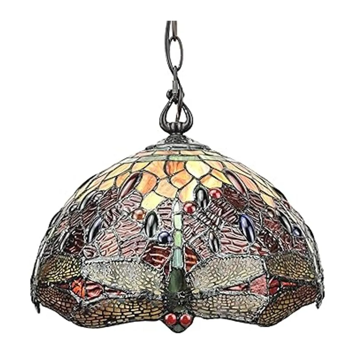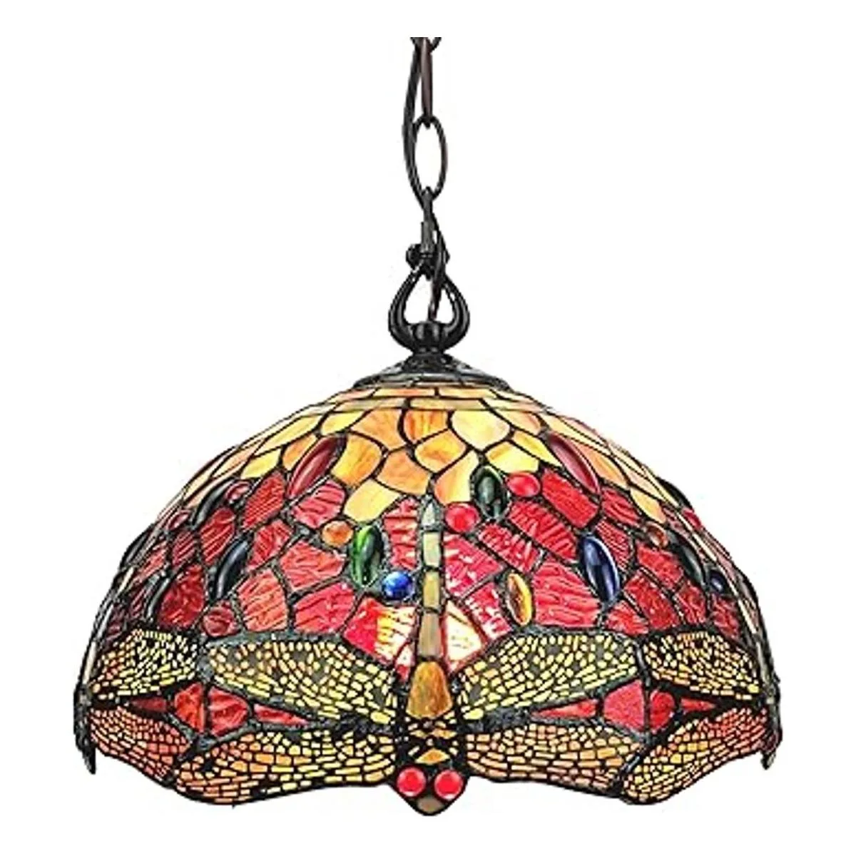 Lámpara colgante colgante estilo Tiffany de 14 pulgadas de ancho, cristal de color rojo, joyas de libélula antigua, decoración de luz vintage, restaurante, juego, sala, comedor, cocina, regalo AM1034HL14B Amora Lighting
