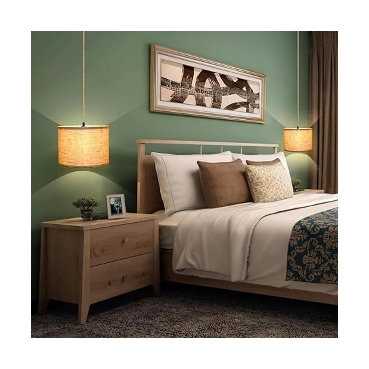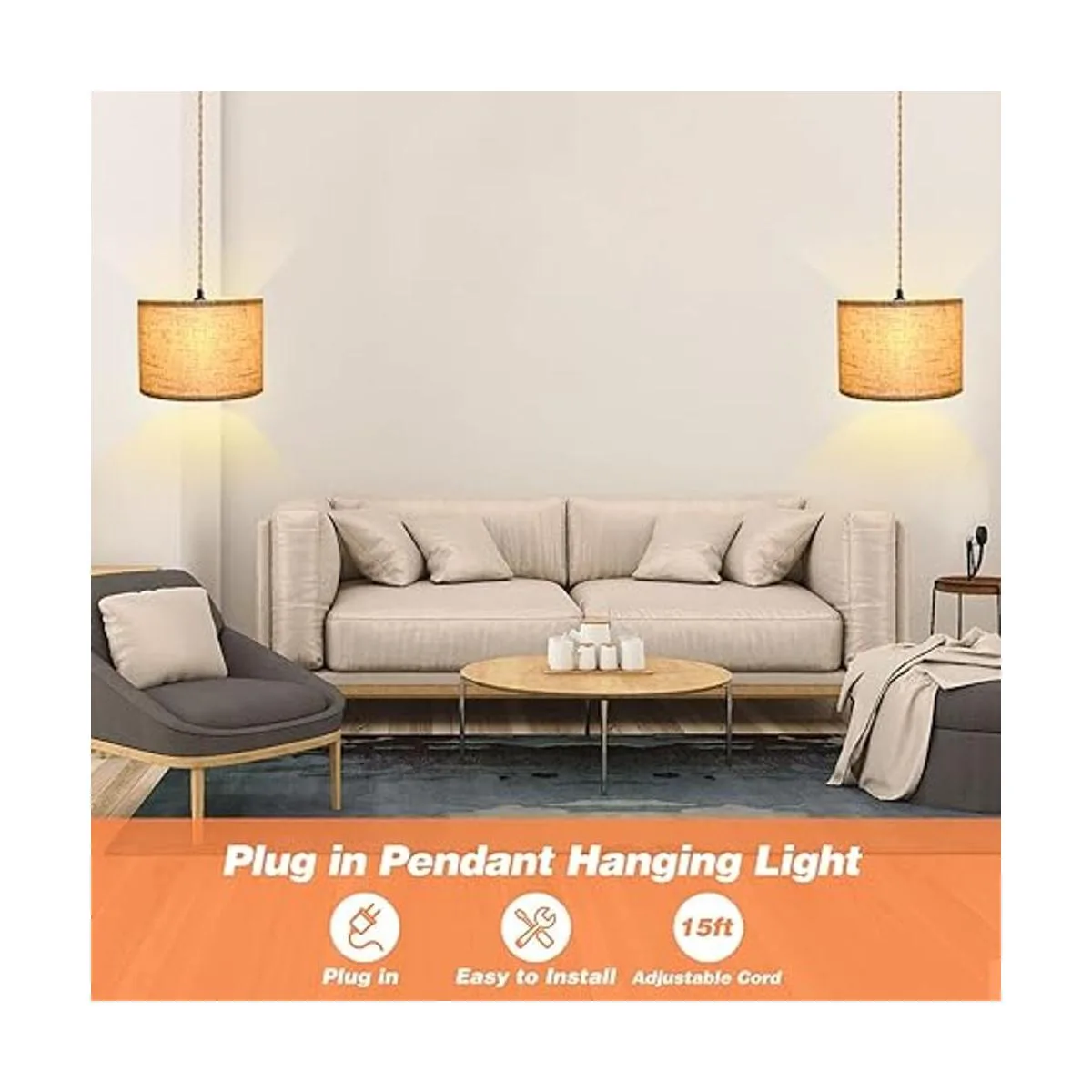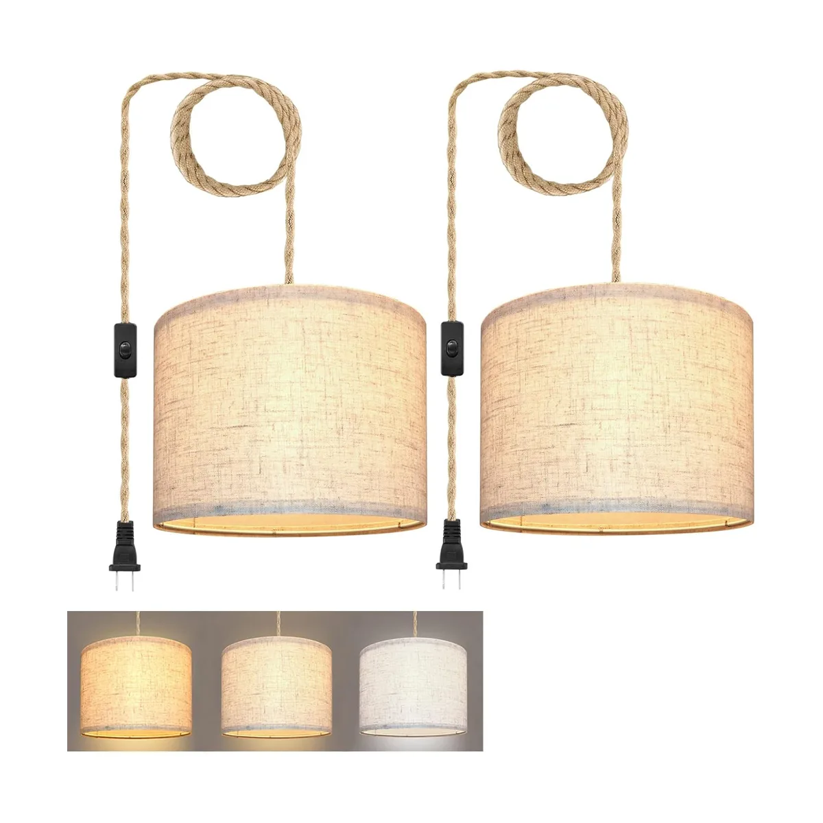 Lámpara colgante con enchufe, luces colgantes con cable de enchufe, lámpara colgante con cuerda de cáñamo de 15 pies, interruptor de encendidoapagado, pantalla de lino beige, lámpara colgante para dormitorio, sala de estar, mesa de comedor, paquete de 2
