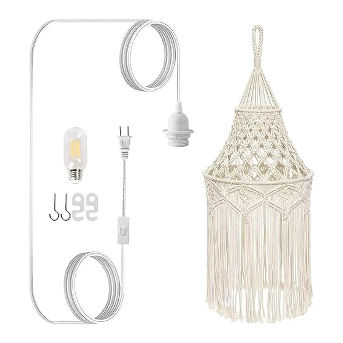Lámpara colgante de macramé estilo bohemio con bombilla colgante con cable de enchufe, interruptor de encendidoapagado, lámparas colgantes bohemias que se enchufan a la toma de pared para decoración de dormitorio, sala de estar