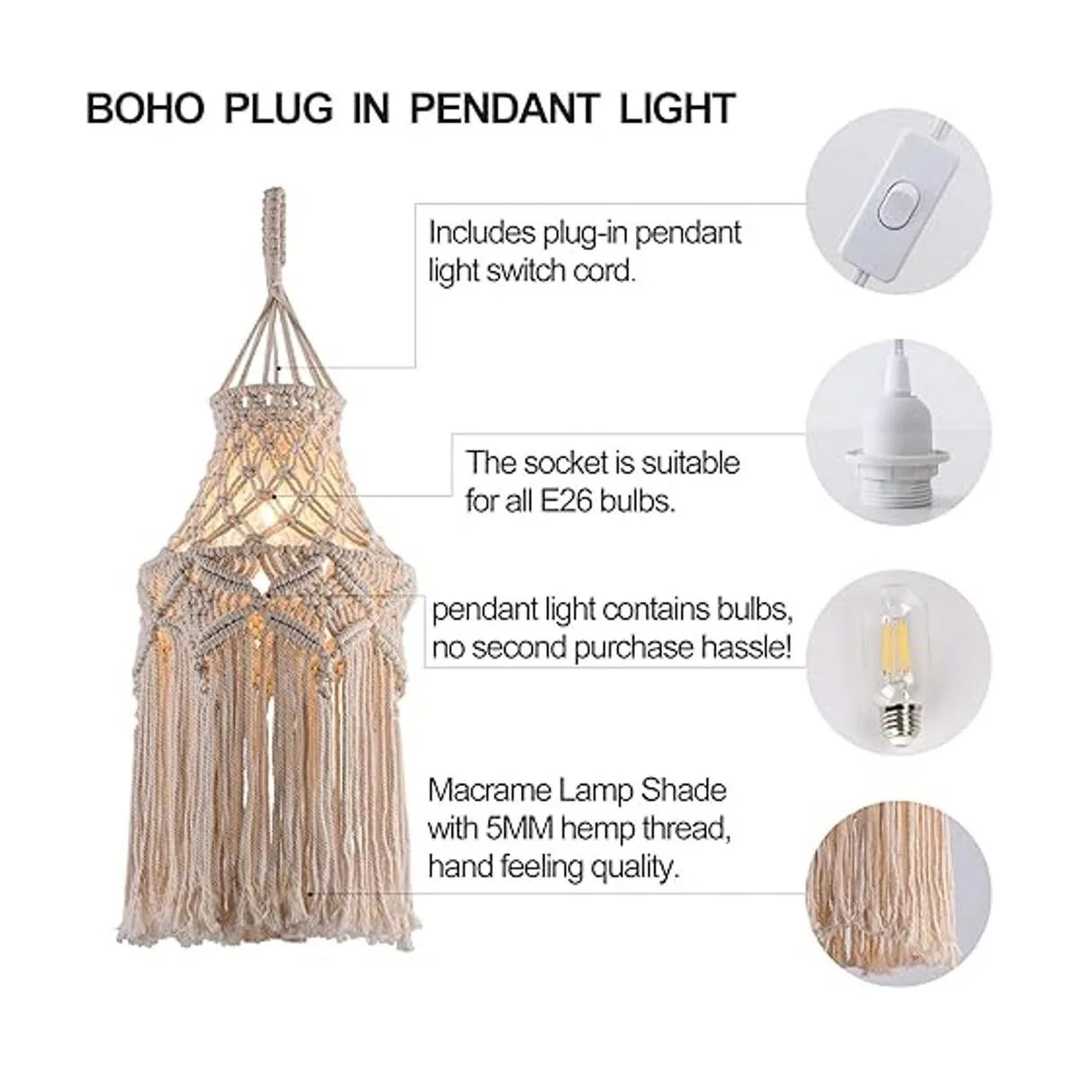 Tamaño : lámpara colgante de macramé con cable de enchufe, el diámetro del anillo más grande es de 12 pulgadas, la altura desde el anillo superior hasta la borla más larga es de 34 pulgadas. La longitud del cable de alimentación del enchufe es de 181 pulgadas. Ajustable. Bombilla incluida.