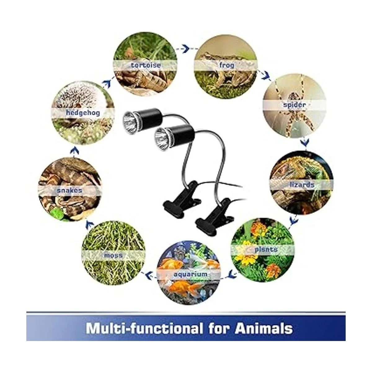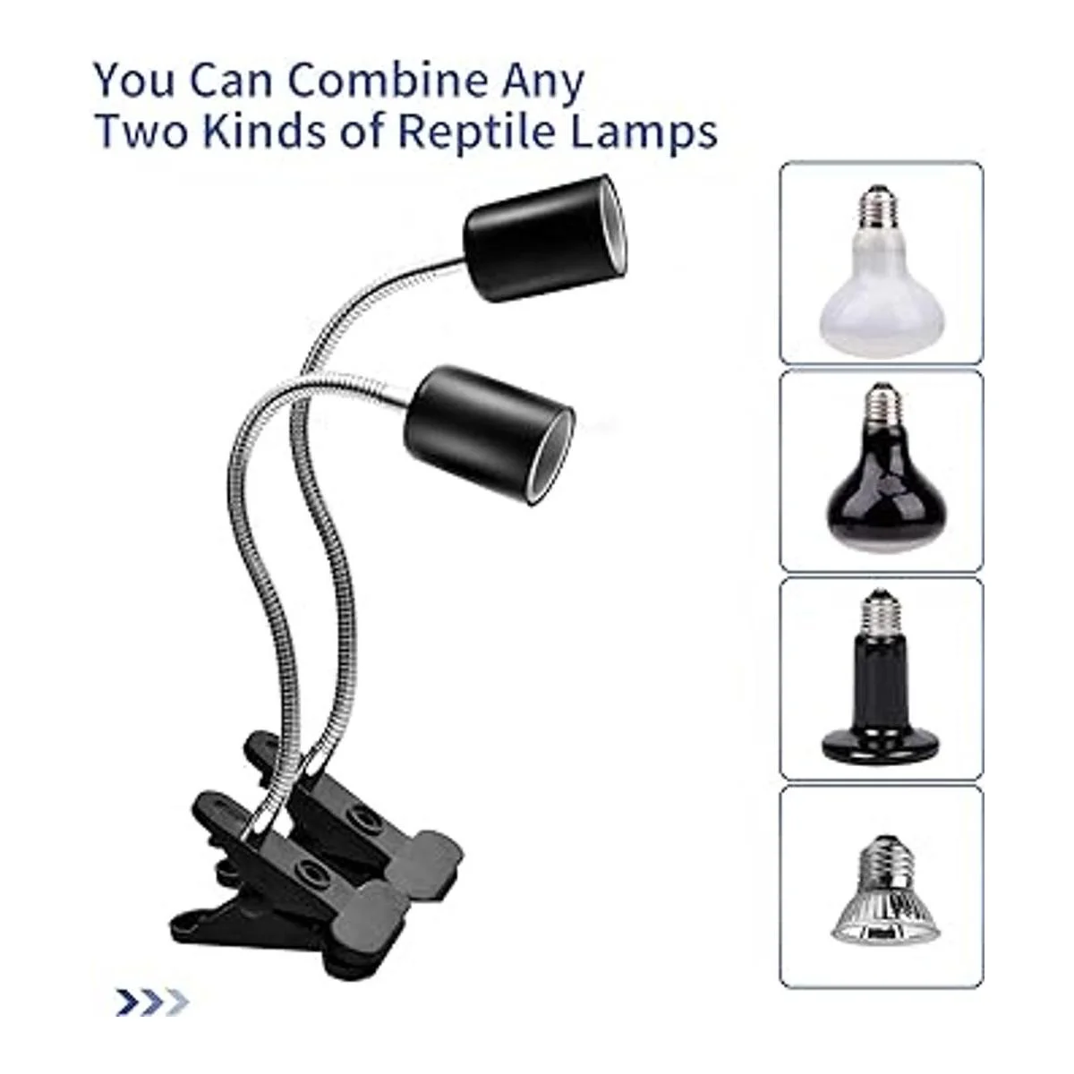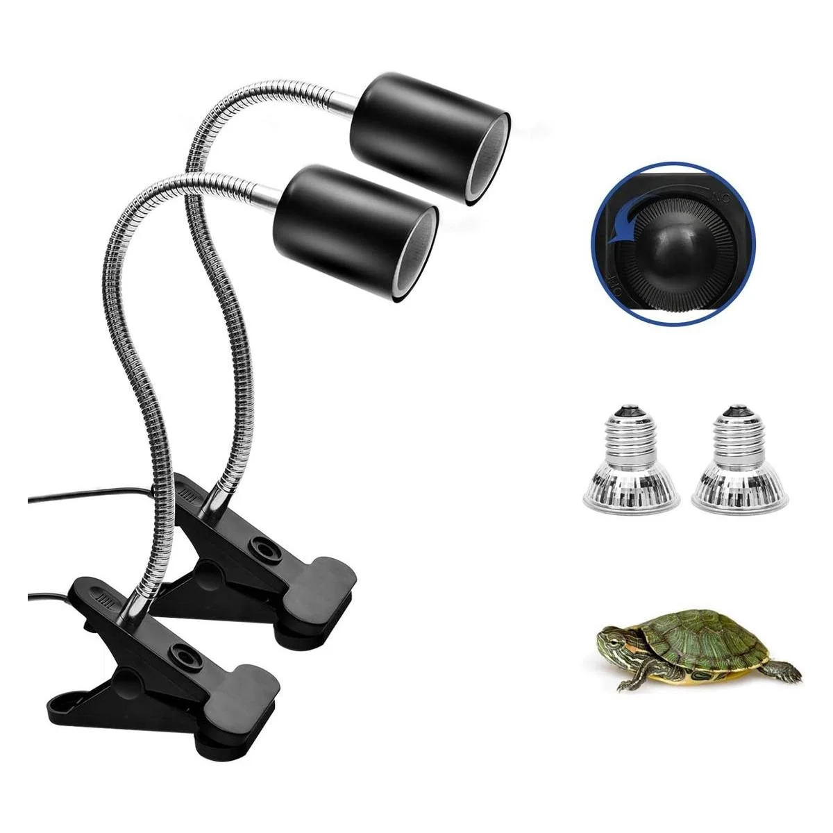 Lámpara de calor para reptiles, lámpara de punto peregrino, paquete de 2 lámparas solares de espectro completo UVA UVB con clips giratorios de 360 e interruptor ajustable para tortuga, lagarto, serpiente, acuario, camaleones, anfibios negro, bombillas de 50W