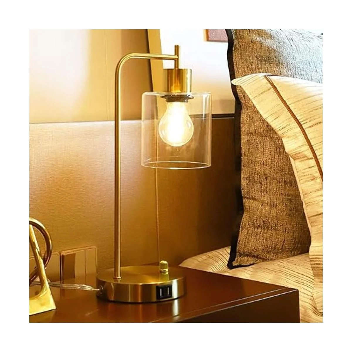 Lámpara de mesa industrial dorada con 2 puertos USB; lámpara vintage de lectura regulable Elizabeth, hecha de latón con bombilla E26 Edison LED con una pantalla de cristal, para dormitorio, sala de estar, oficina