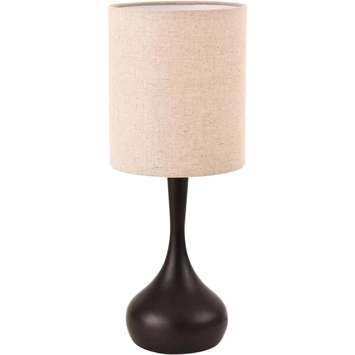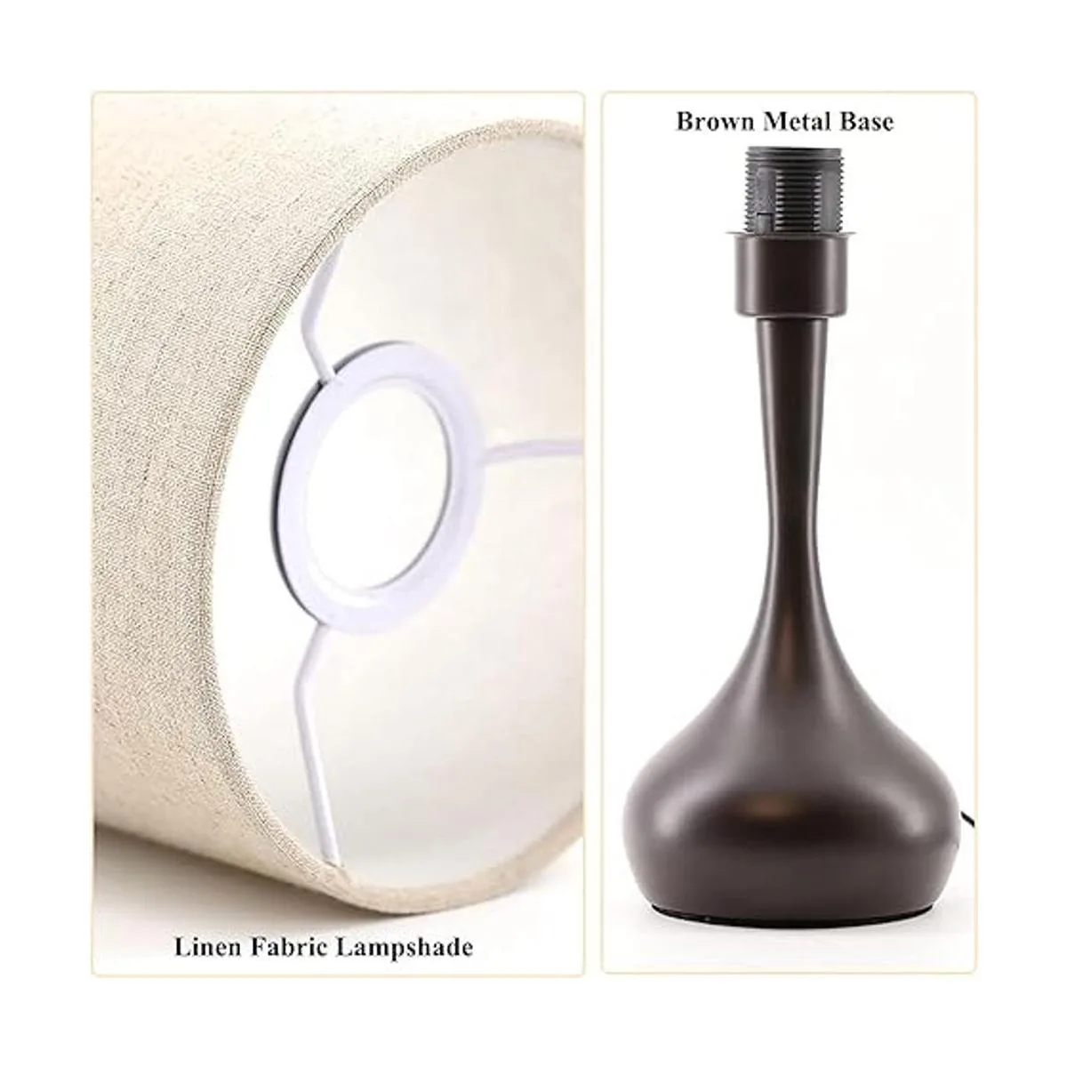Lámpara de mesa moderna, base marrón, luz de escritorio pequeña de 17.3 pulgadas con gotita de metal, pantalla de tambor de lino cilíndrico, lámpara de mesita de noche para dormitorio, sala de estar, mesita de noche
