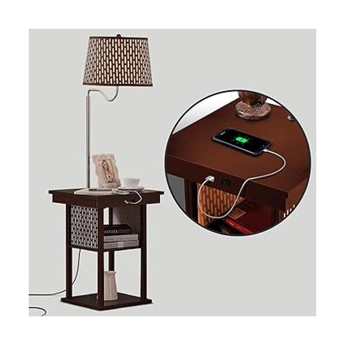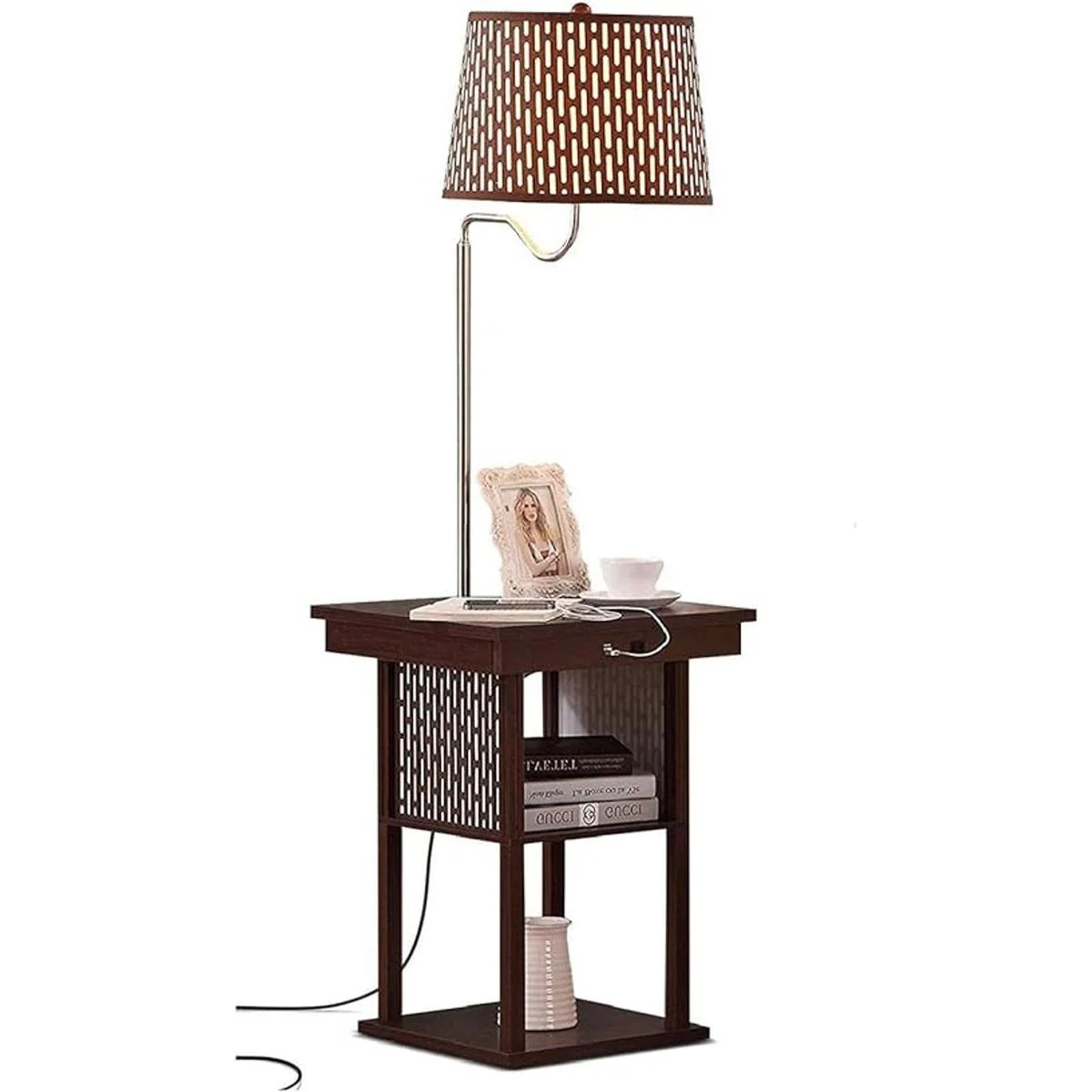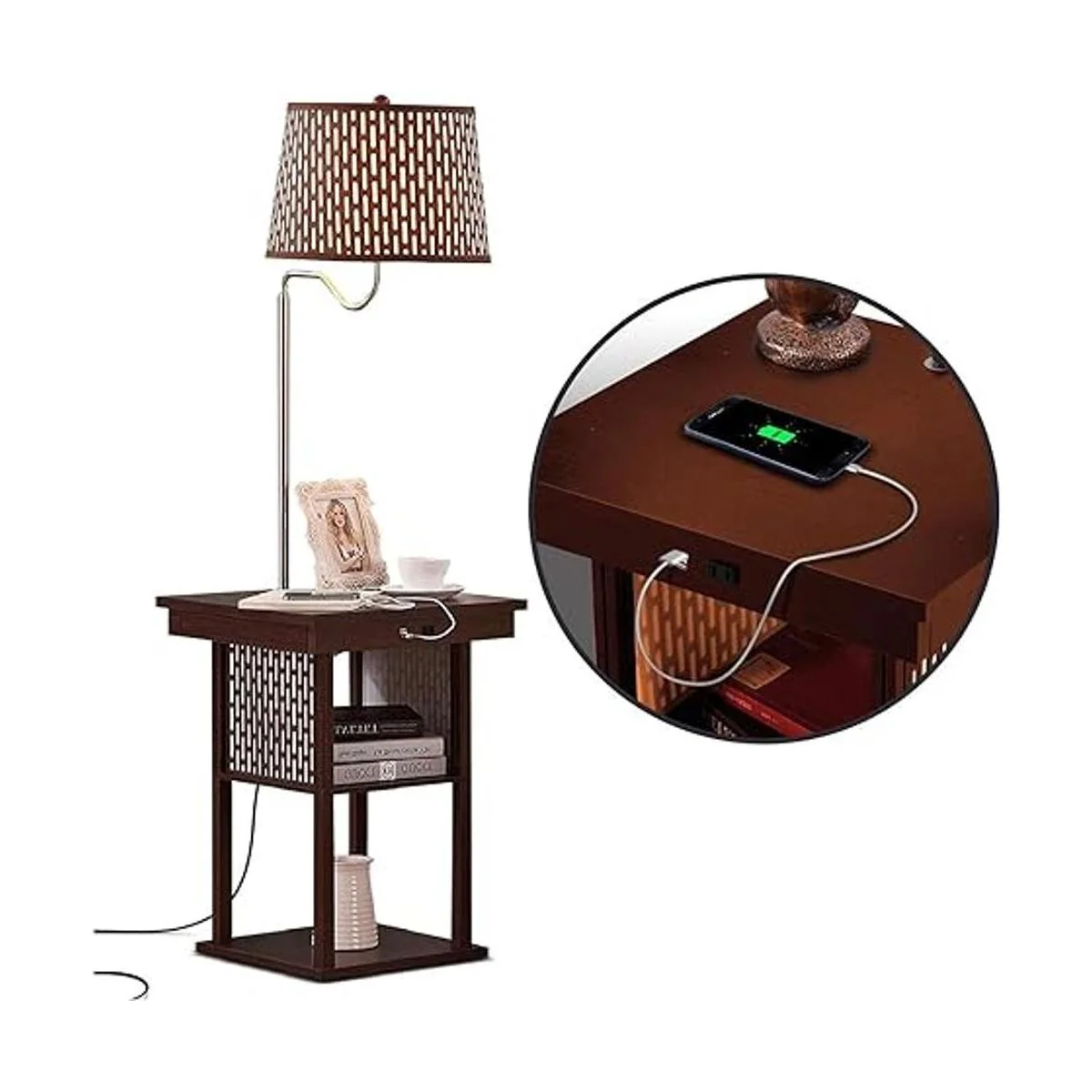 Table Lamp Combo For Home Office Average nightstands are 20 X 20 wide; the Madison is 18 X 18 narrow. It saves space in small rooms like kids rooms, guest room, offices. The floor lamp cant be knocked off because it is attached. This end table with a floor lamp also has two USB ports and an outlet so that you can charge your mobile devices or plug in your computer, a great reading lamp for bedroom, living room.